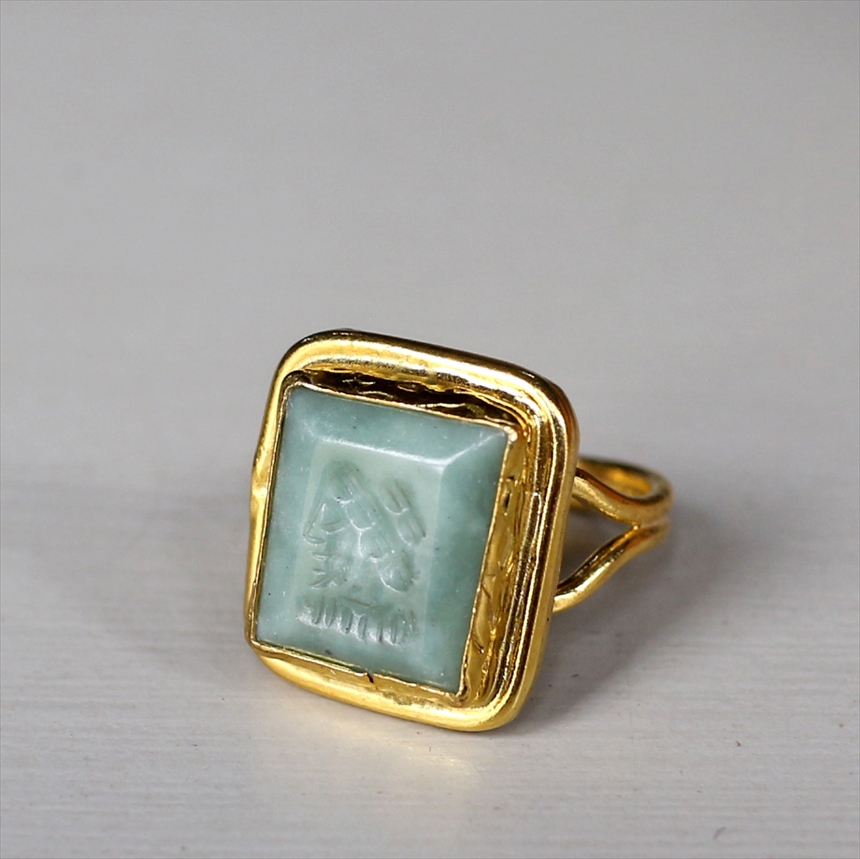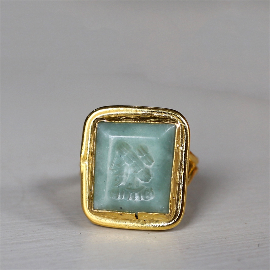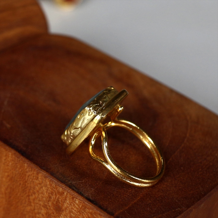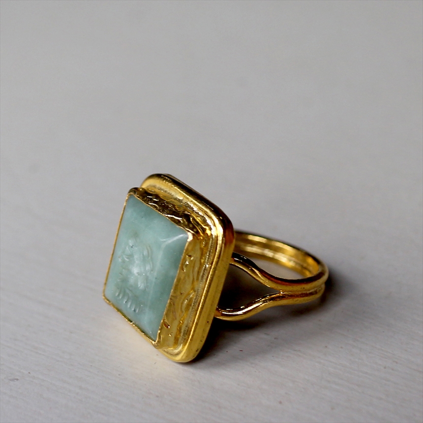 アルサメイア インタリオリング スクエア グリーンジェイド 天然石22Kゴールドプレーテッド トルコジュエリー