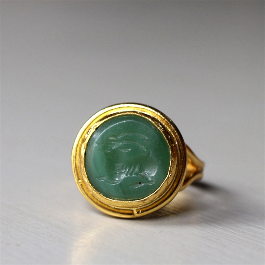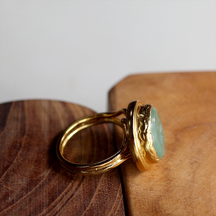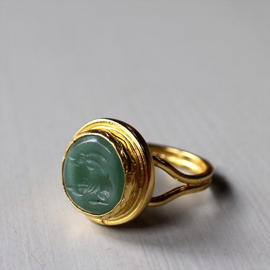 天然石に動物モチーフを、一つ一つ丁寧に沈み彫り(インタリオ)した、クラシカルな雰囲気のリングです。