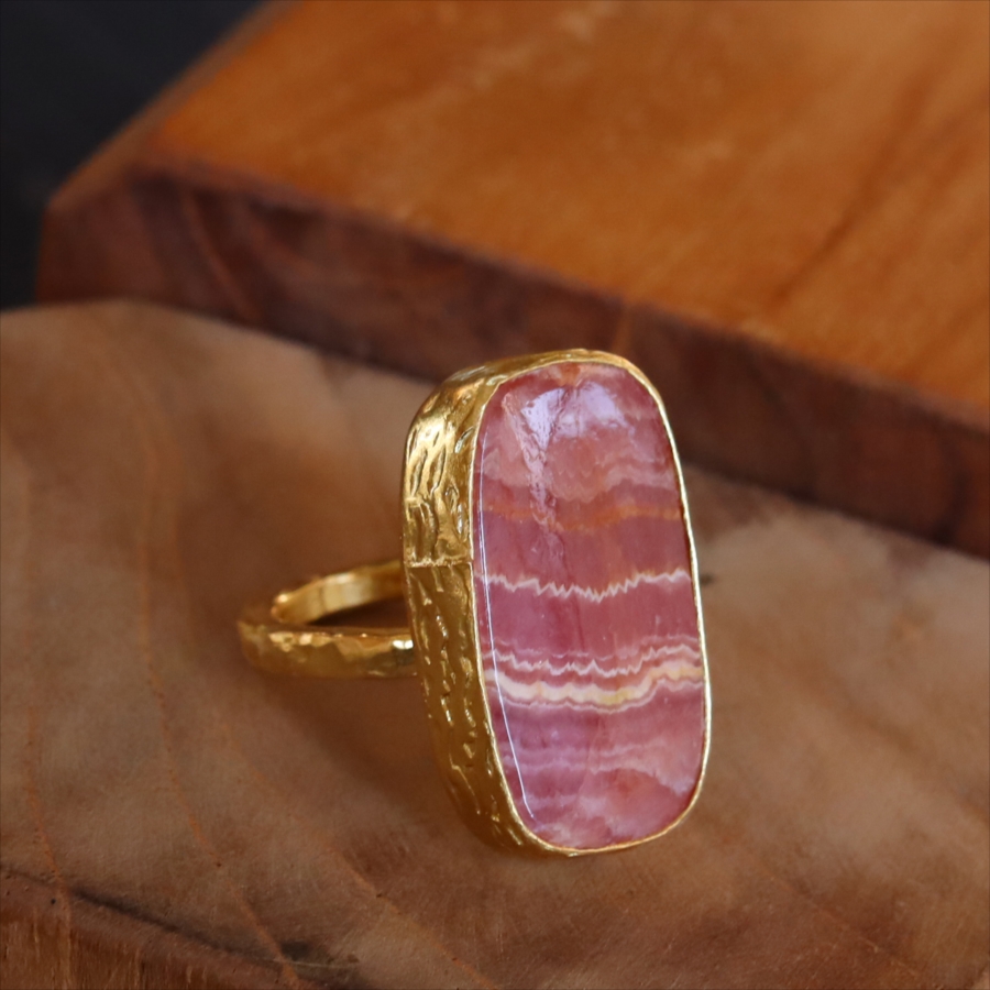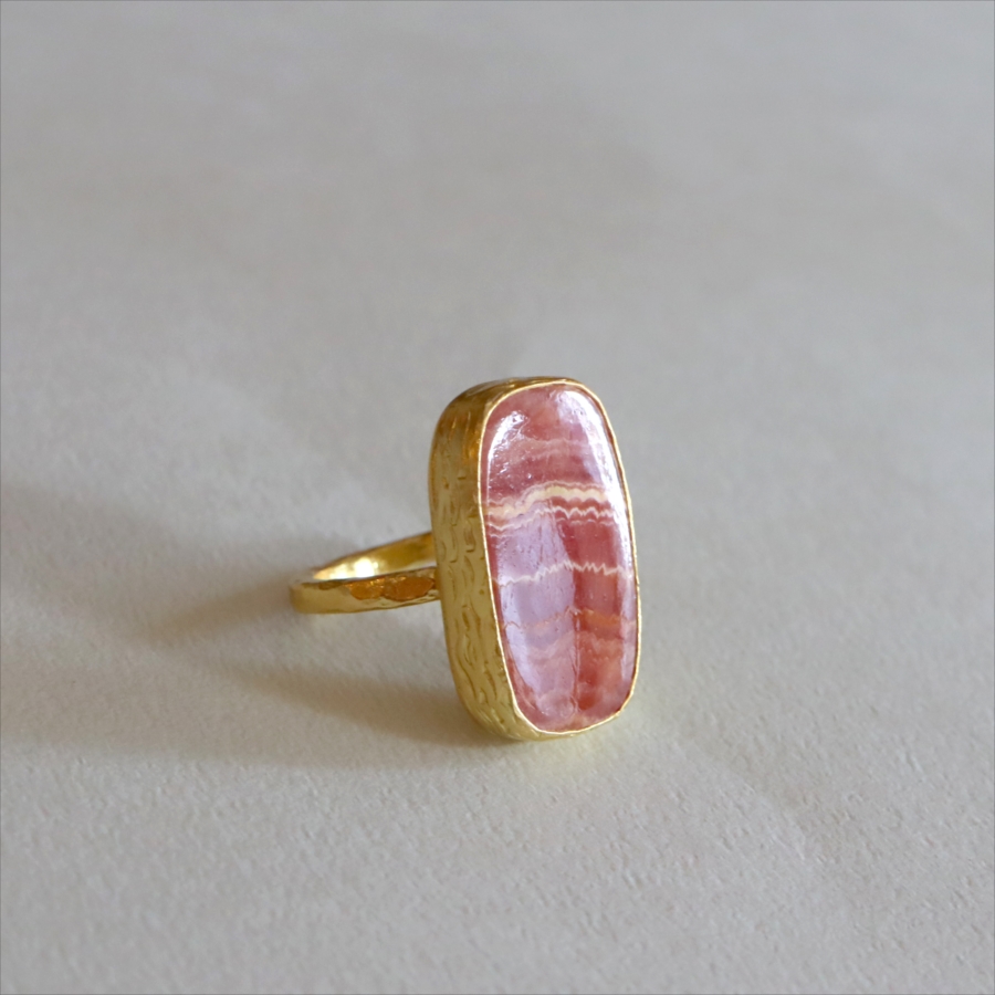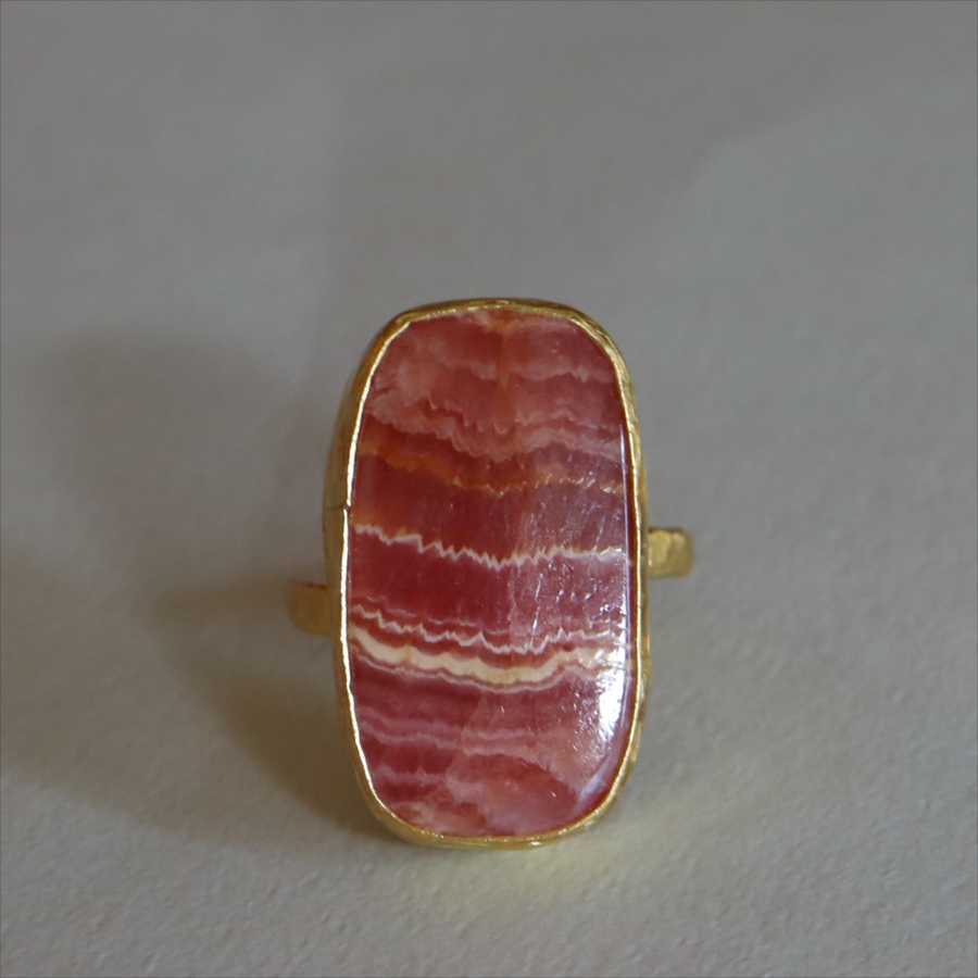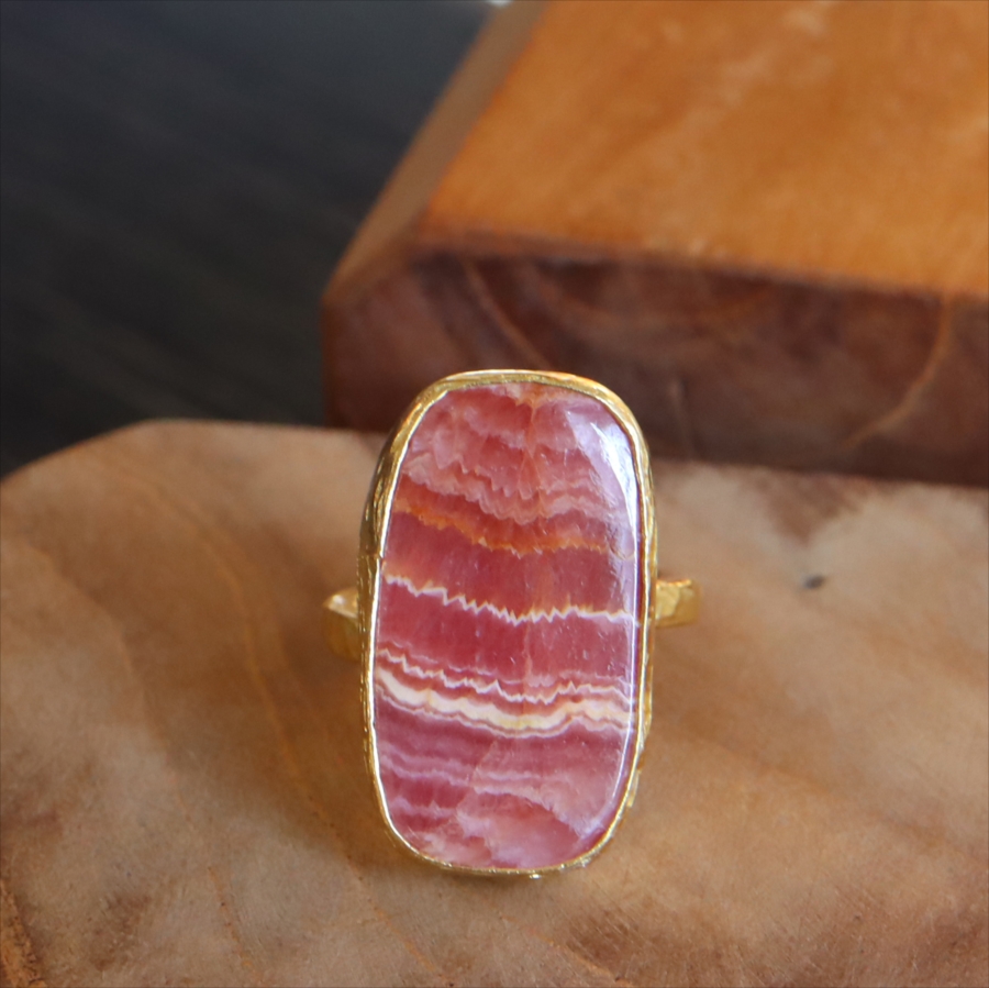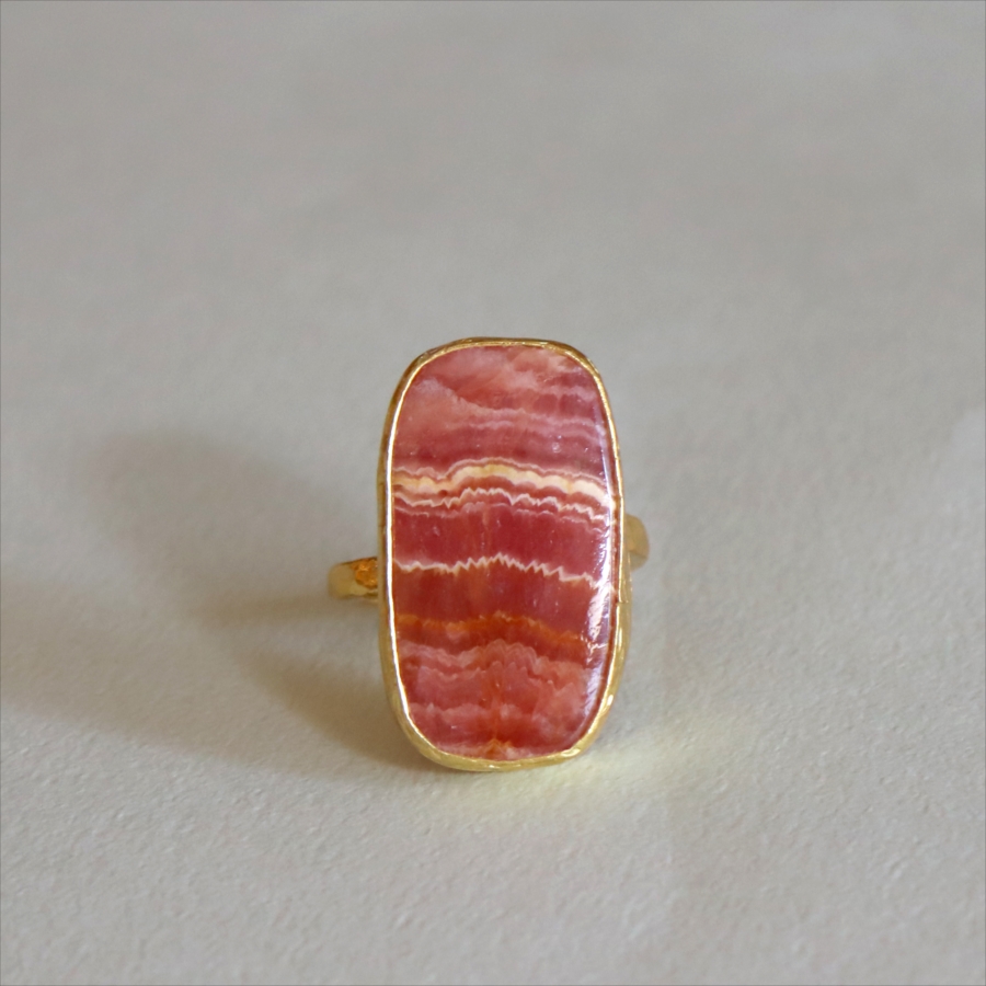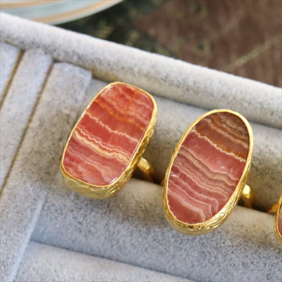 深いローズピンクから深みのあるオレンジがかった色まで、幾重にも重なった縞模様が印象的なロードクロサイト(Rhodochrosite)のリング。まるで大地の記憶を閉じ込めた地層のような模様は、自然が長い時間をかけて生み出した一点ものの表情です。同じ石はふたつと存在せず、その個性こそがこのリングの最大の魅力。眺めるたびに、新しい表情を見せてくれます。
