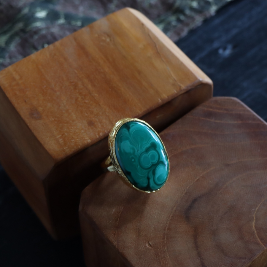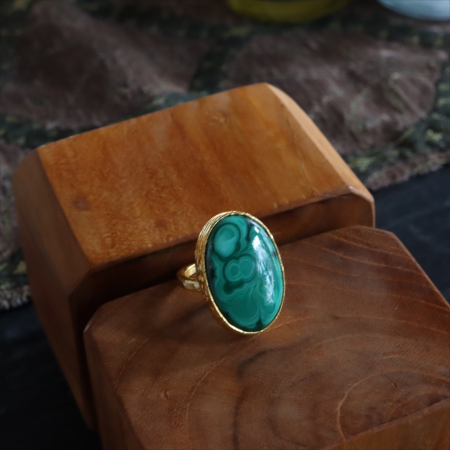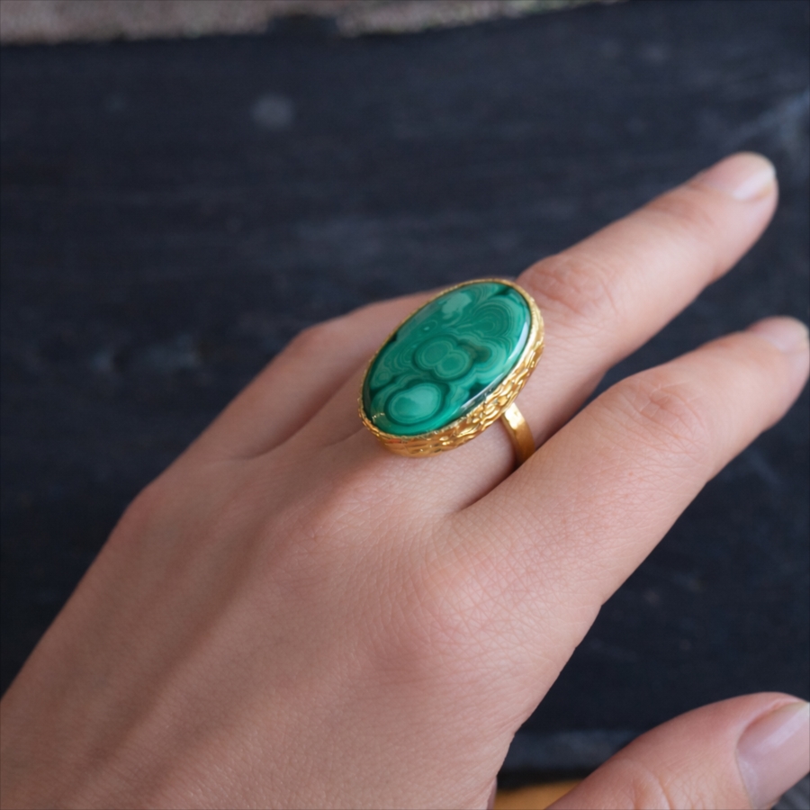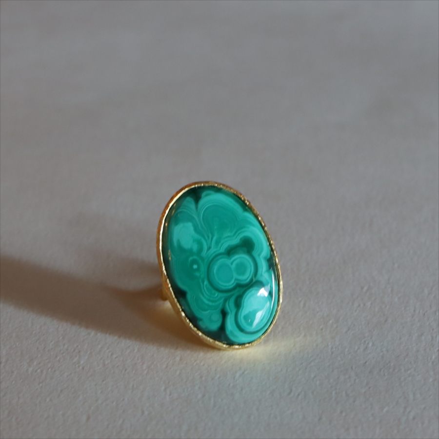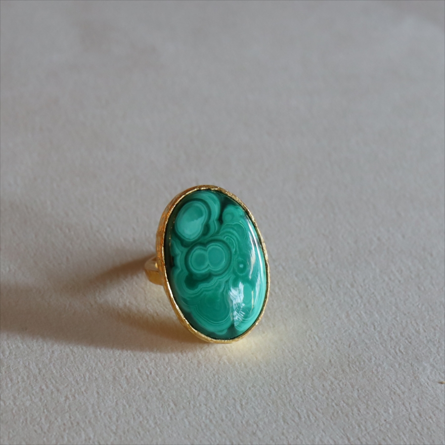 大粒のマラカイトを引き立てるため、デザインはあえてシンプルに。大胆なのにどこか落ち着きがあり、指先にしっくりなじむバランス感も魅力です。