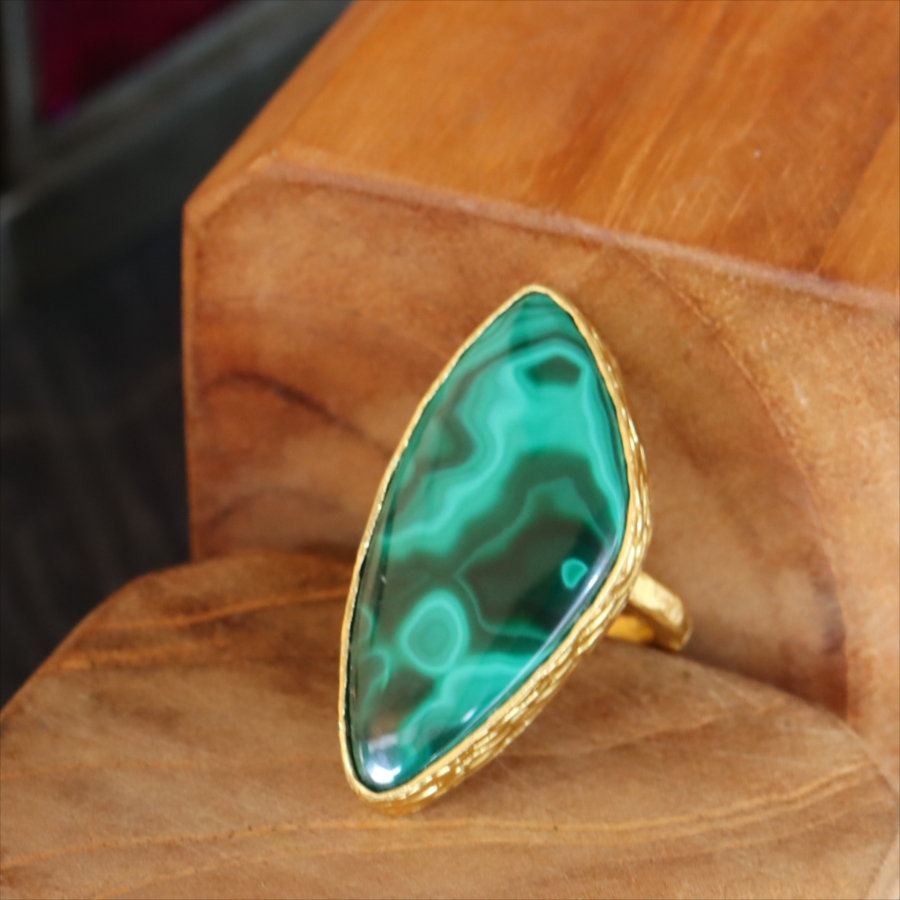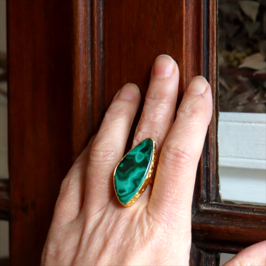 大粒のマラカイトを引き立てるため、デザインはあえてシンプルに。大胆なのにどこか落ち着きがあり、指先にしっくりなじむバランス感も魅力です。