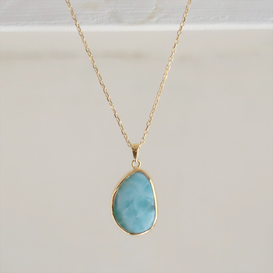 【ラリマー Larimer】ラリマーは、ペクトライトという鉱物の一種で、カリブ海のドミニカ共和国でのみ産出される希少な天然石です。銅を含むことで生まれるやわらかなブルーと、白い雲や波のような模様が特徴。