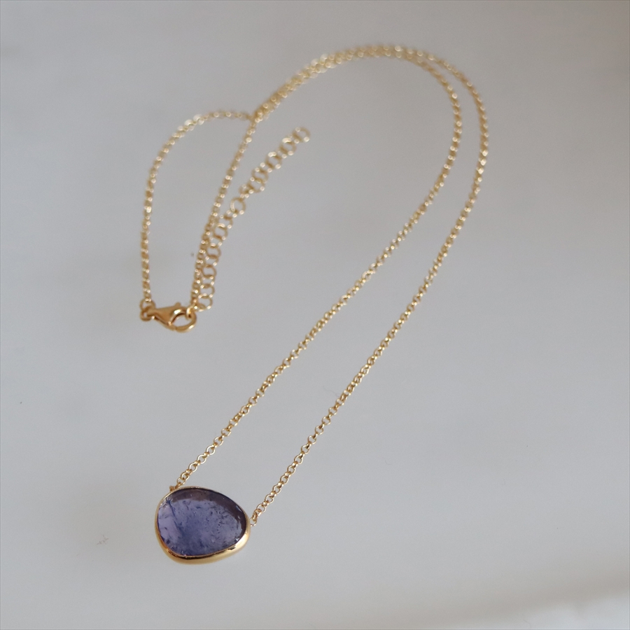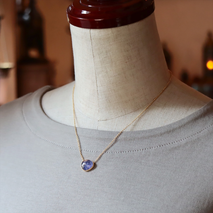 深いブルーからバイオレットまで様々な色をあわせ持つタンザナイトのネックレスです。蛍光灯の下では、きらっとネオンのように光って見えることも。ランダムにカットされた石がハンドメイドらしい温かみを感じられる一点もののネックレスです。