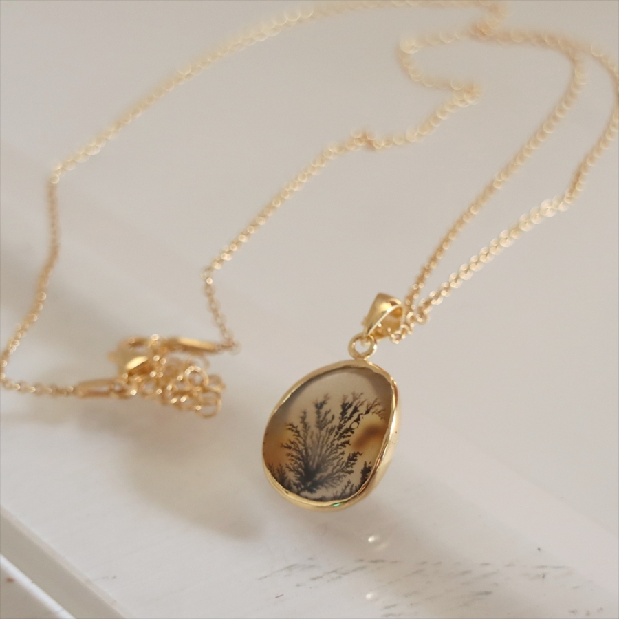 まるで樹木のシルエットのよう!でもこれは自然が創り出した鉱物の結晶が、枝のように広がったものなのだそうです。霧の中にたたずむ森や、冬枯れの枝先のようにも見えるその姿は、眺めるたびに想像をかき立てる幻想的な美しさを秘めています。同じものはふたつとない、地球からの贈り物です。自然が描いた小さな風景を、そっと身にまとってみてくださいね。
