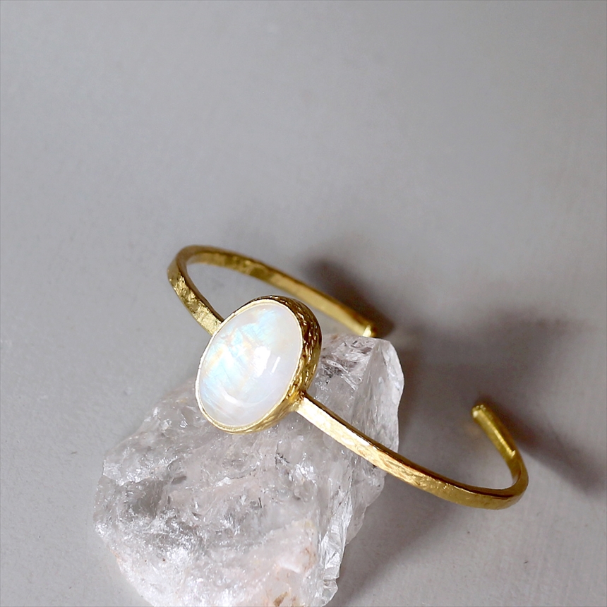 神秘的な月光を閉じ込めたかのような、美しいムーンストーンのバングルです。ぷっくりとした厚みのあるカボションカットが施されているため、光を内側からとらえ、虹色のシラーがより立体的に、そしてダイナミックに現れます。華奢なゴールドアームとのバランスが洗練された雰囲気を演出します。