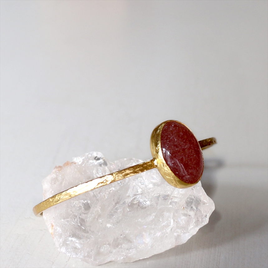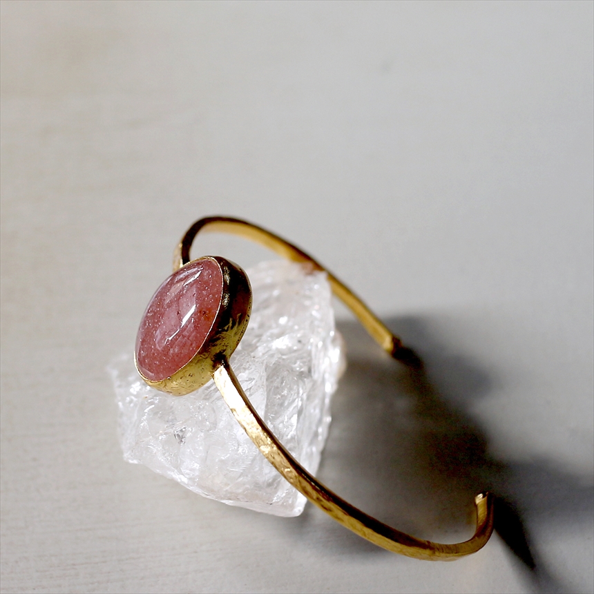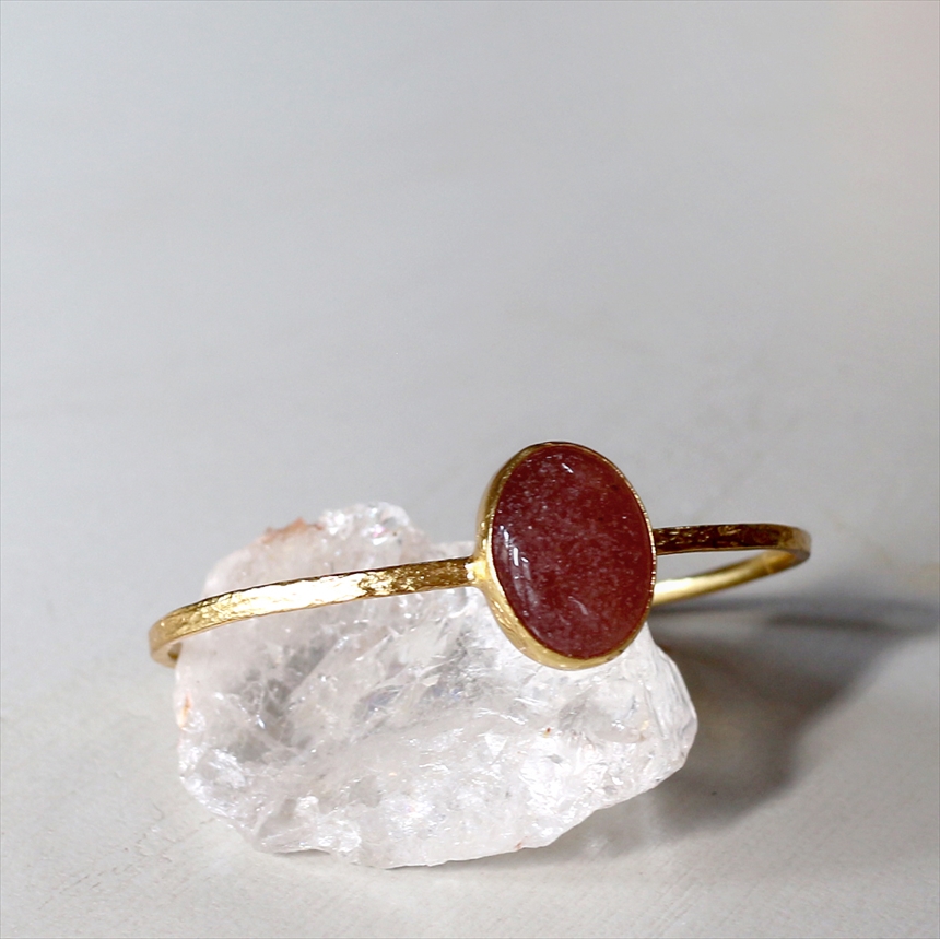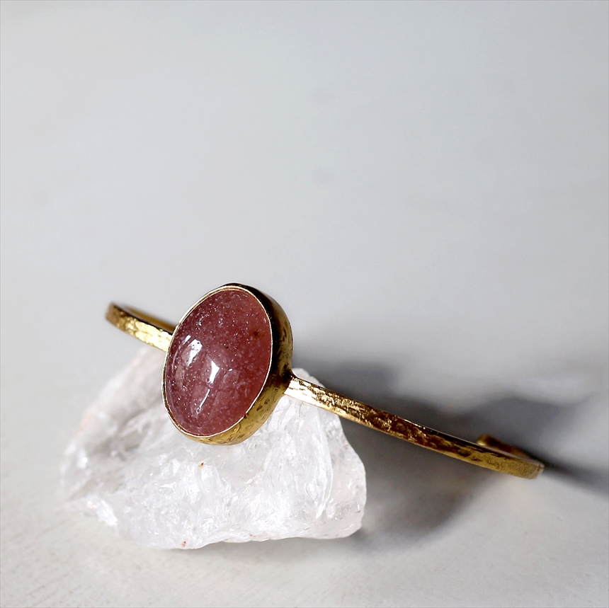 大粒の深みあるくすみレッドのストロベリークォーツのゴールドバングル。打ち加工がされたシンプルなゴールドアームは、無駄なデザインを省きクールな印象です。