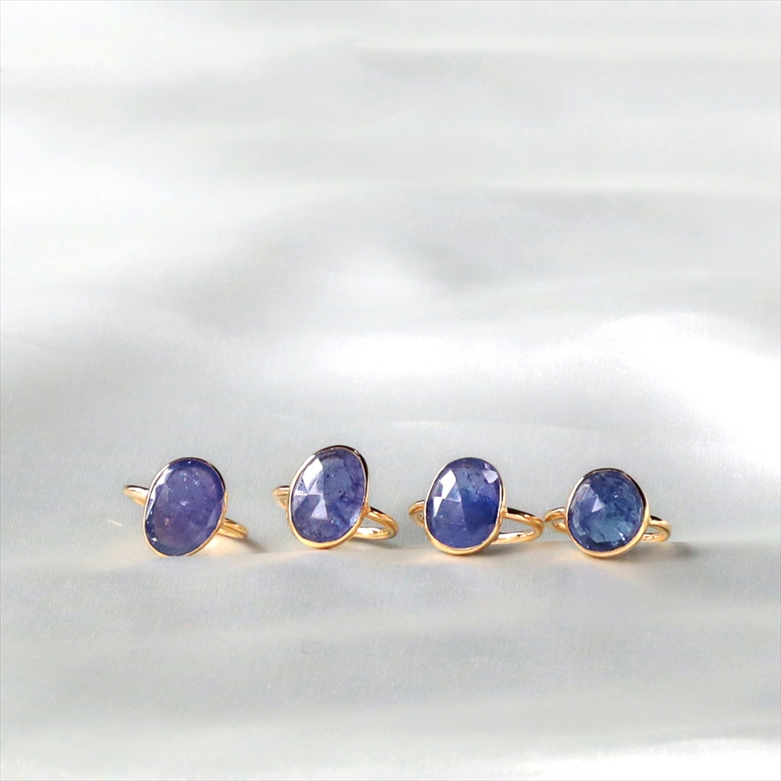 青紫や群青色、見る角度によって、グリーンやピンクなど様々な色彩の混じりあうブルーカラーが大変美しい石、タンザナイト。華やかで存在感あるリングです。