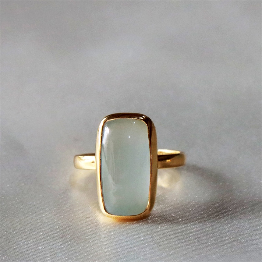 瑞々しく輝くグリーンがかったアクアマリンのリングです。厚みのあるカボションカットが、内側から溢れるような、とろみのある光を優しく取り込みます。スクエアフォルムが甘さを抑え、知的な印象を与えます。