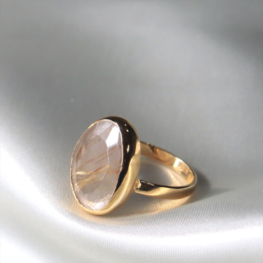 クリアなクォーツの中に繊細なゴールドの針(ルチル)が閉じ込められた、自然が生んだ神秘ともいえる、ルチルクォーツのリングです。肌に溶け込むヌーディーな色調にゴールドが煌めき、手元をより洗練された知的な印象にみせてくれます。