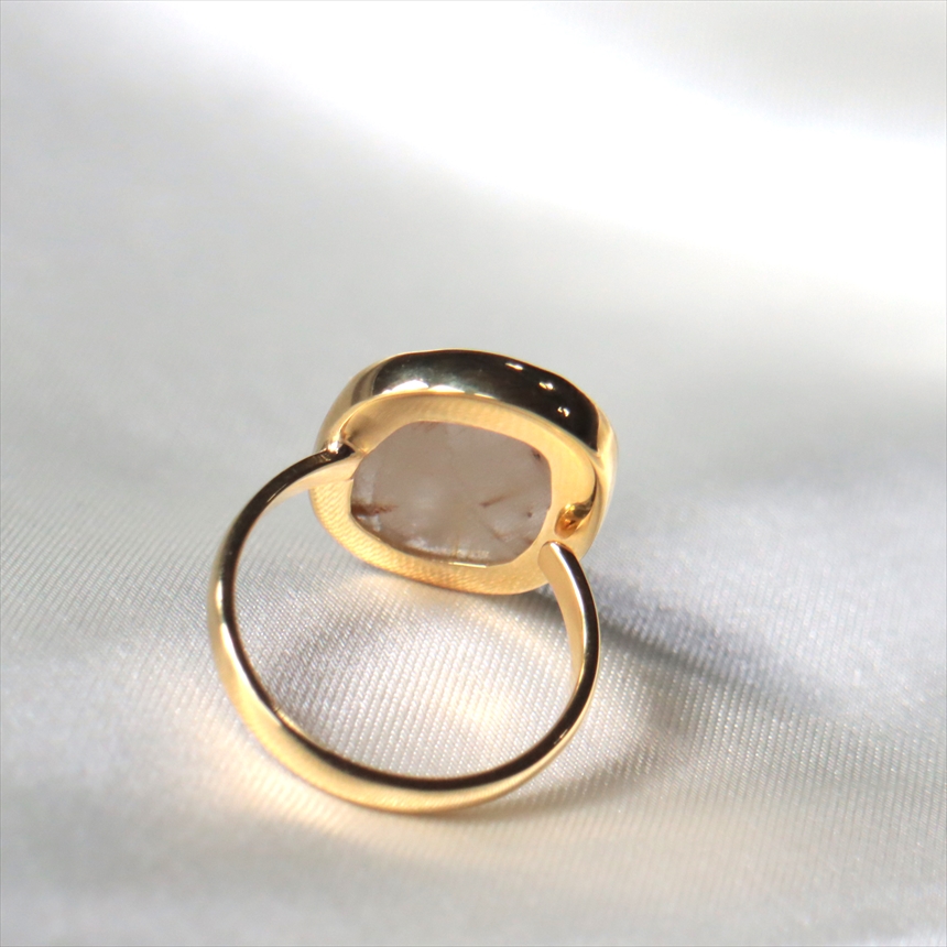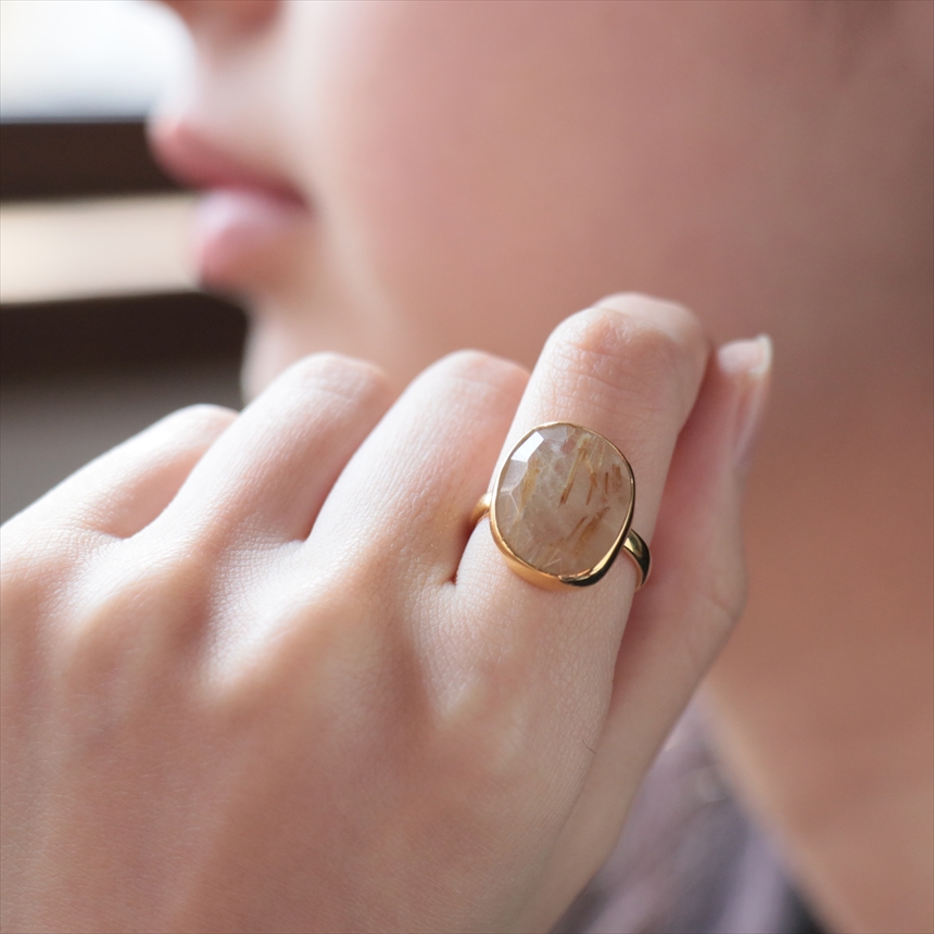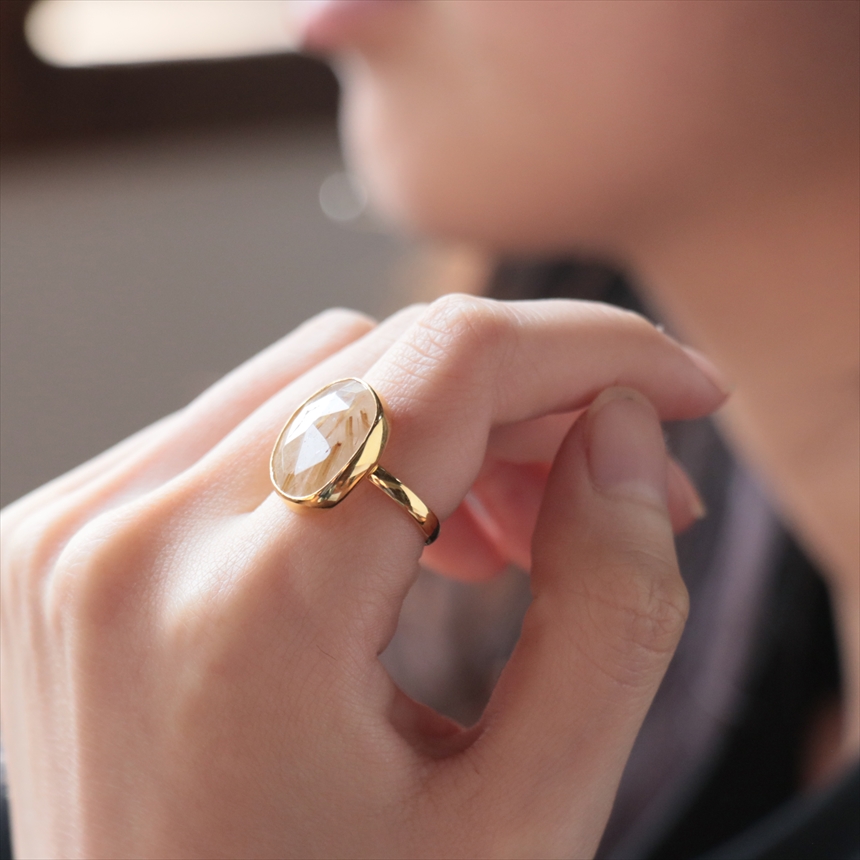 クリアなクォーツの中に繊細なゴールドの針(ルチル)が閉じ込められた、自然が生んだ神秘ともいえる、ルチルクォーツのリングです。肌に溶け込むヌーディーな色調にゴールドが煌めき、手元をより洗練された知的な印象にみせてくれます。