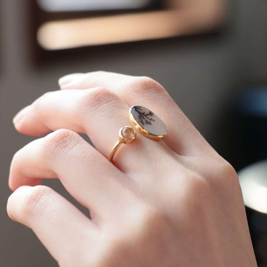 やわらかな乳白色の水晶の中にシダ植物のような模様(内包物)が広がるデンドライトと、黄金の針が輝くルチルクォーツを配した、まるで指先の美術館のようなリングです。一粒ごとに異なる絵画のような天然石の表情が、手元を見るたびに深い癒やしを与えてくれます。