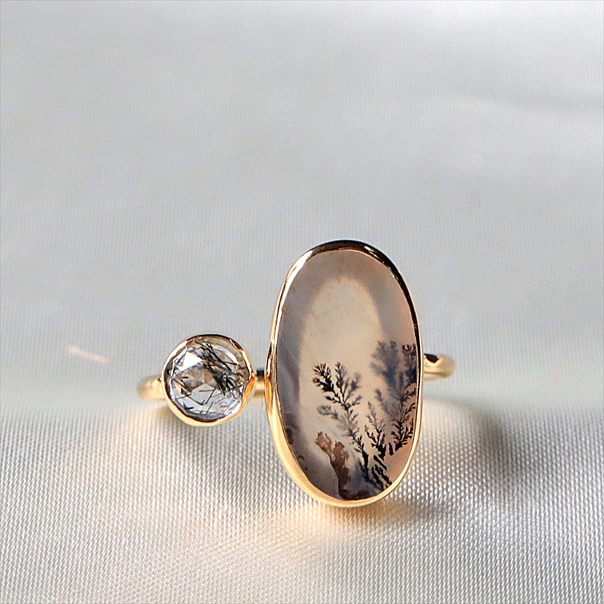 やわらかな乳白色の水晶の中にシダ植物のような模様(内包物)が広がるデンドライトと、黒い針が輝くブラックルチルクォーツを配した、まるで指先の美術館のようなリングです。一粒ごとに異なる絵画のような天然石の表情が、手元を見るたびに深い癒やしを与えてくれます。