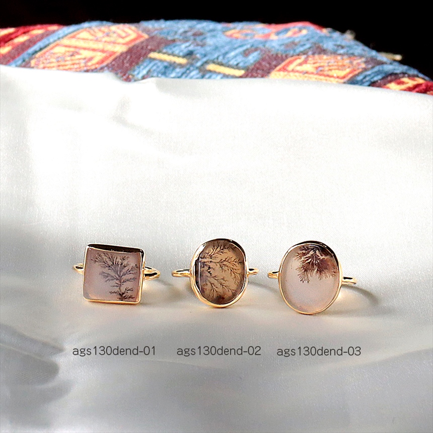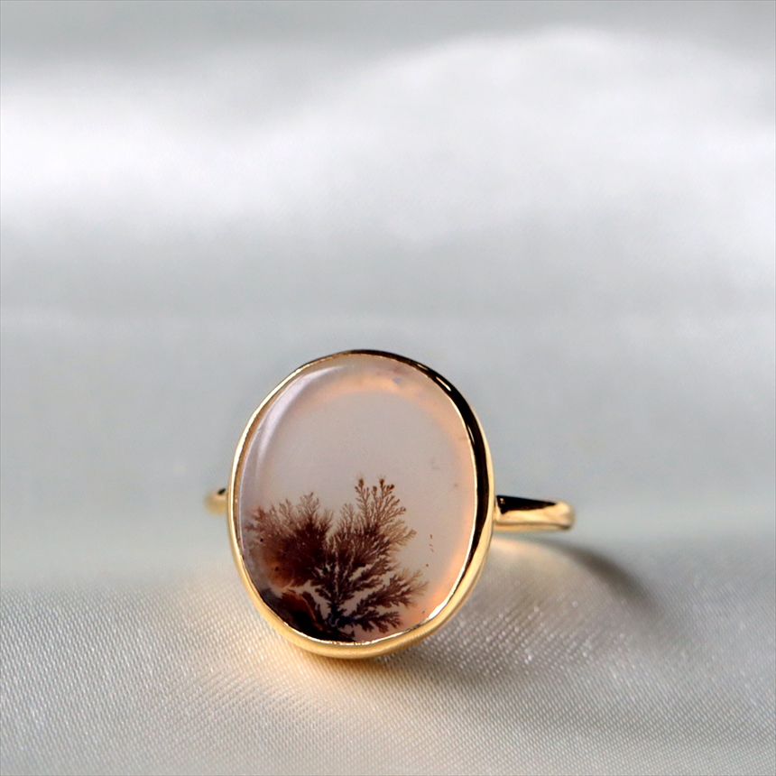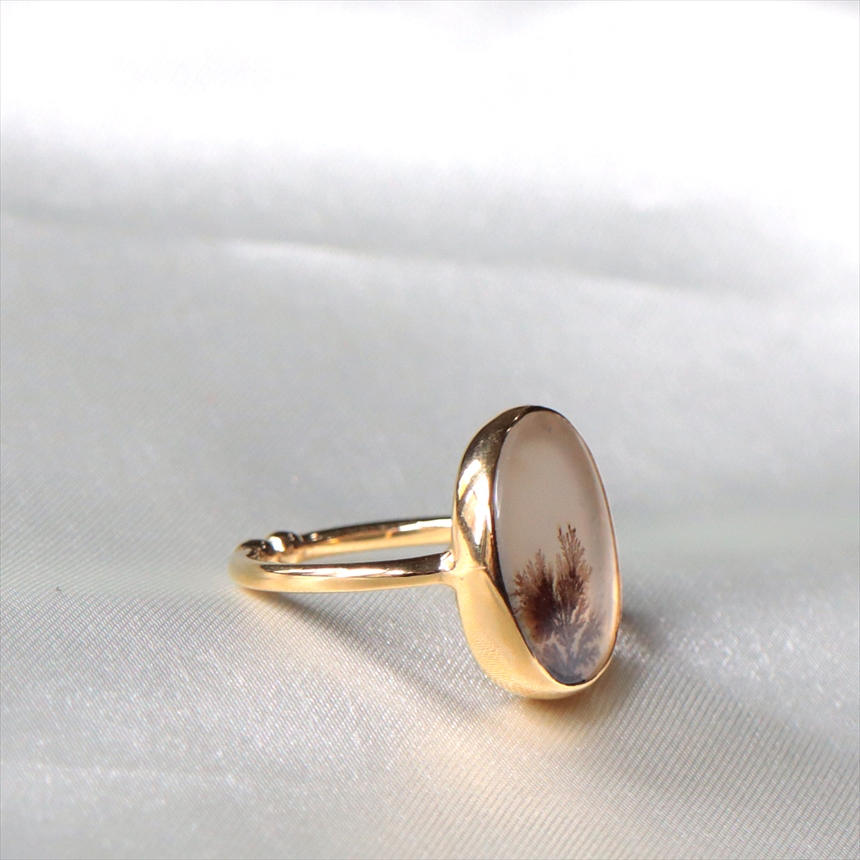 やわらかな乳白色の水晶の中にシダ植物のような模様(内包物)が広がるデンドライトのリングです。一粒ごとに異なる絵画のような天然石の表情が、手元を見るたびに深い癒やしを与えてくれます。