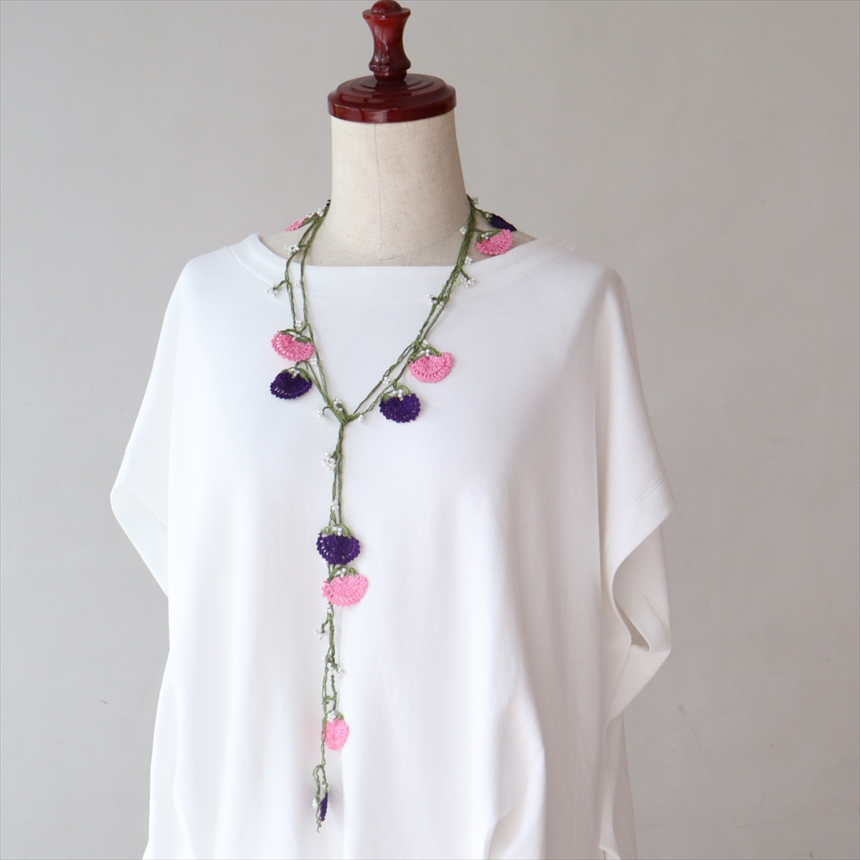 トルコの伝統的な手芸「オヤ」をモチーフにして、手編みで作られたネックレスです。このピースは、かぎ針で編んだ「トゥ・オヤ」の大ぶりな平面モチーフが使われた華やかなデザイン。