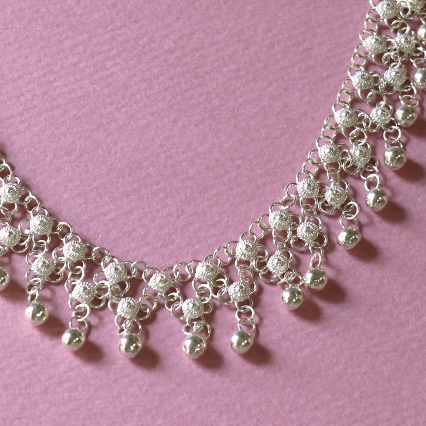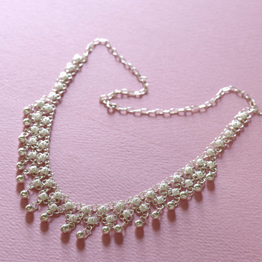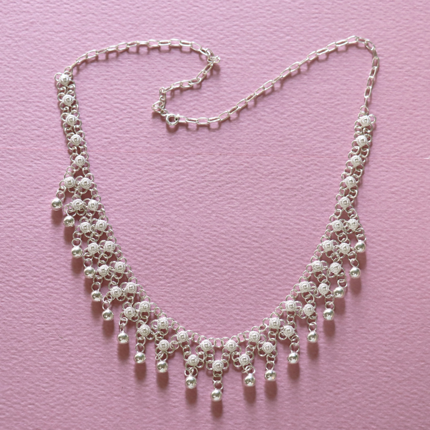 イスラムの女性たちは黒いチャドルの下にたくさんの装飾品をつけて着飾ります。手仕事で一つ一つつなぎ合わせられ網のようになっているネックレスは、見た目よりもずっしりとシルバーの重みを感じることができます。シャラシャラと揺れる動きをお楽しみください。