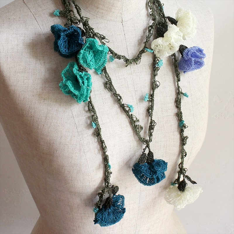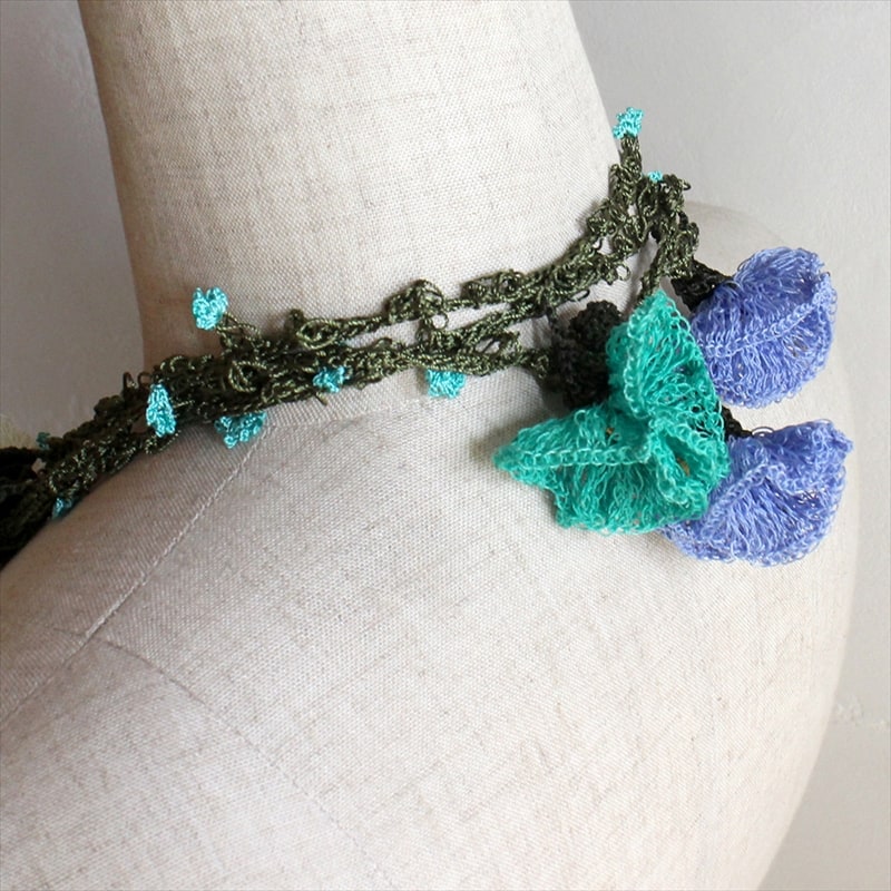 トルコの伝統的な手芸「オヤ」をモチーフにして、手編みで作られた巻きつけるタイプのロングネックレスです。このピースは、かぎ針編みの「トゥ・オヤ」で、立体的で大きなスイトピーのような花が編みこまれたゴージャスな一本。短めに襟元に巻きつけても素敵です!