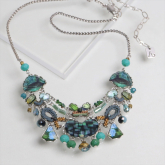 天然の水晶を使った透明感のあるジュエリー。立体的なパーツは胸元でキラっと光り、存在感たっぷりです。