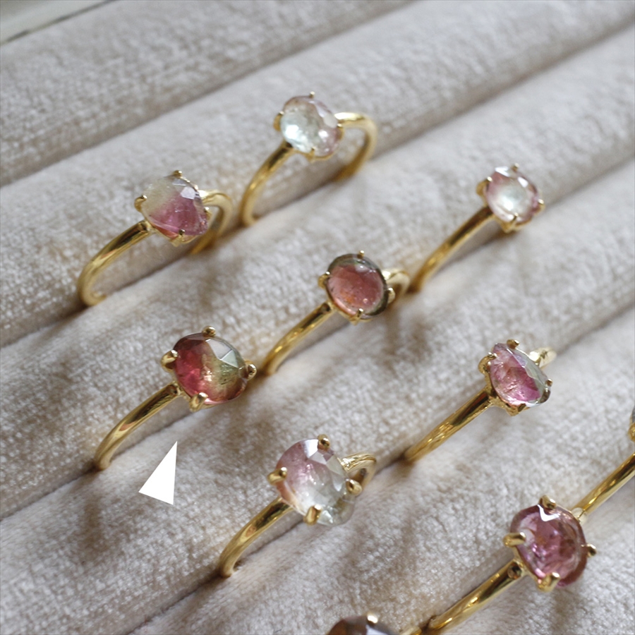 ラフにカットされたウォーターメロントルマリンの一粒リング。指にちょこんと乗るようなかわいらしいサイズながらも、ローズカットが施され、つぼみの様な立体感のあるデザインです。ウォーターメロントルマリンとは、その名の通り、スイカのように外側がグリーンで、内側が赤いピンクの配色からなるバイカラートルマリンのことをいいます。爪留めデザインは周りからたくさんの光がさすので、石のそのままの美しさを引き立てます。