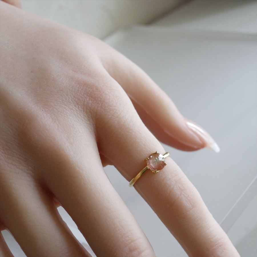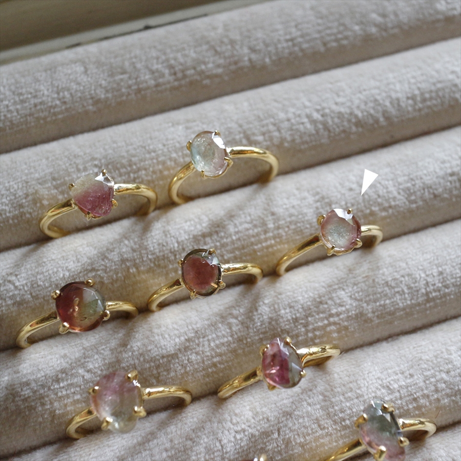 ラフにカットされたウォーターメロントルマリンの一粒リング。指にちょこんと乗るようなかわいらしいサイズながらも、ローズカットが施され、つぼみの様な立体感のあるデザインです。ウォーターメロントルマリンとは、その名の通り、スイカのように外側がグリーンで、内側が赤いピンクの配色からなるバイカラートルマリンのことをいいます。爪留めデザインは周りからたくさんの光がさすので、石のそのままの美しさを引き立てます。