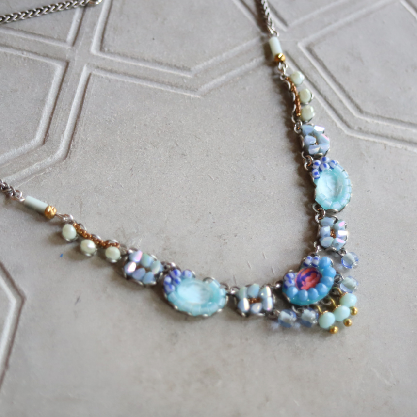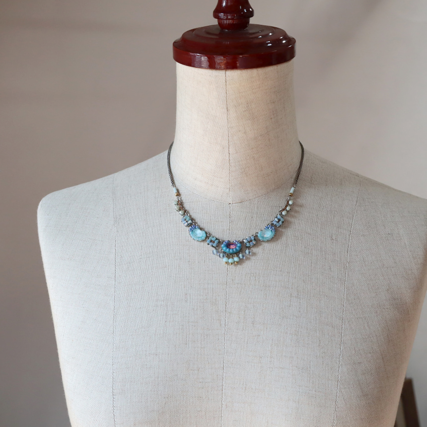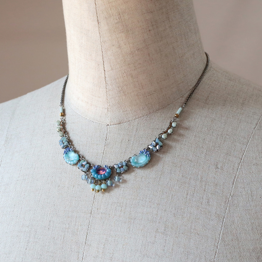 ブルーグラデーションの繊細なビーズ細工が優雅さを醸し出す、Blue Birdという名のシリーズ。少しマットな質感のビーズに中央のピンクがアクセントになっています。