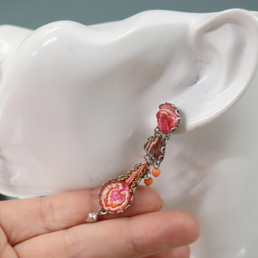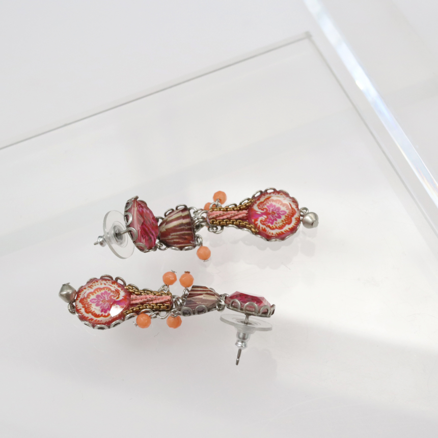 繊細でローズトーンが優雅な印象の、Rose Embraceという名のシリーズ。クリスタルには細やかな植物などのプリントファブリックが写ります。先についたサーモンピンクのビーズが揺れるロマンティックな雰囲気のピアスです。