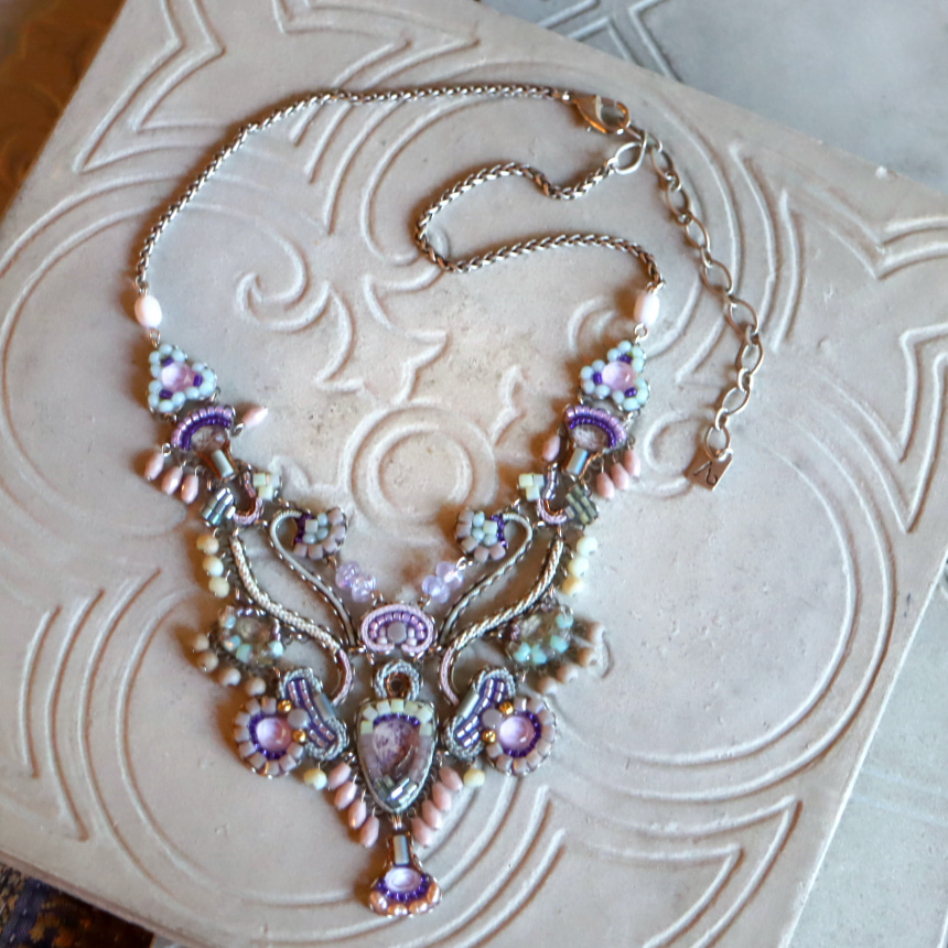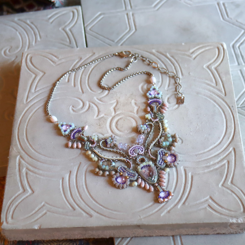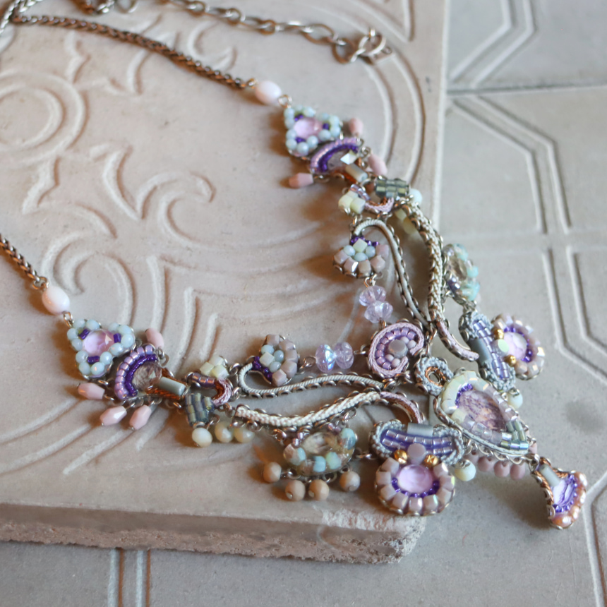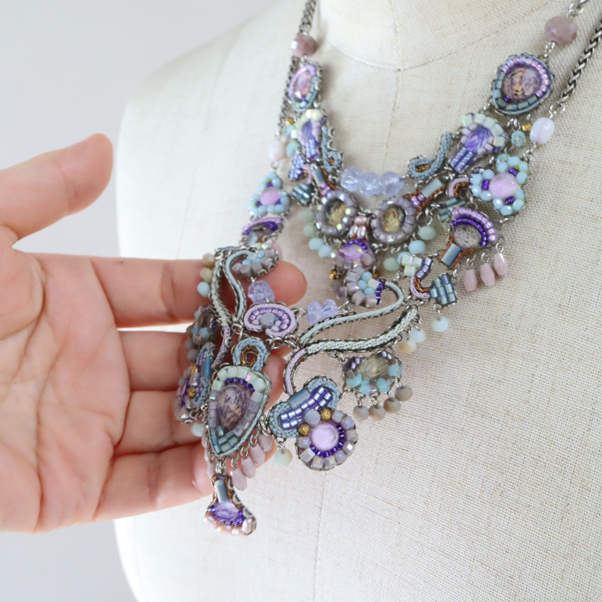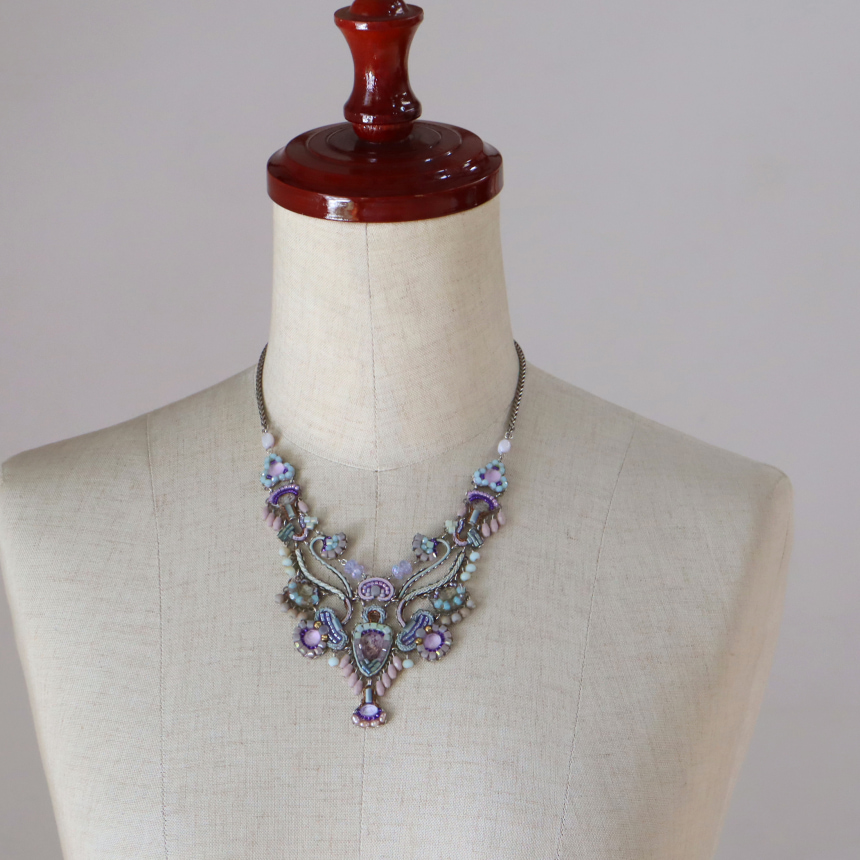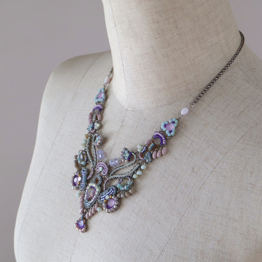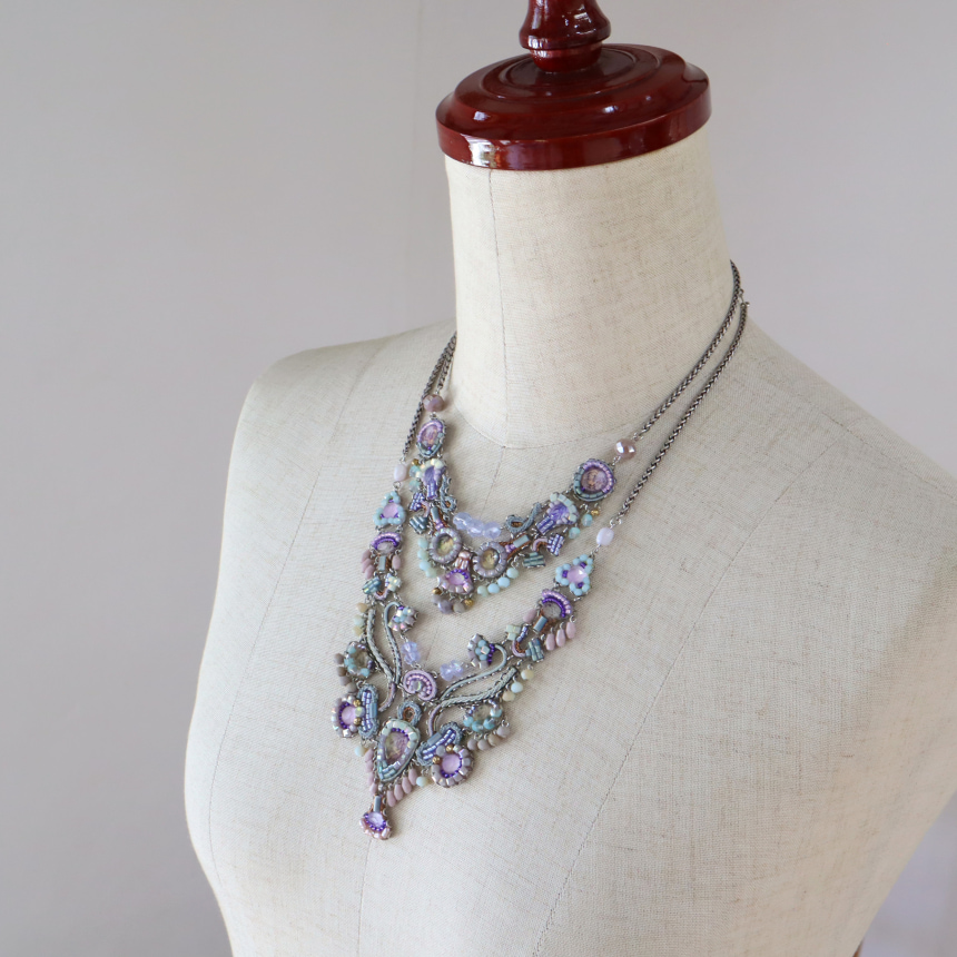 淡いパープル、グレー、ブルーやベージュピンクの柔らかな色合いが魅力的な、ヒヤシンスという名のシリーズ。落ち着いたトーンの中にもさりげない華やかさのあるネックレスです。