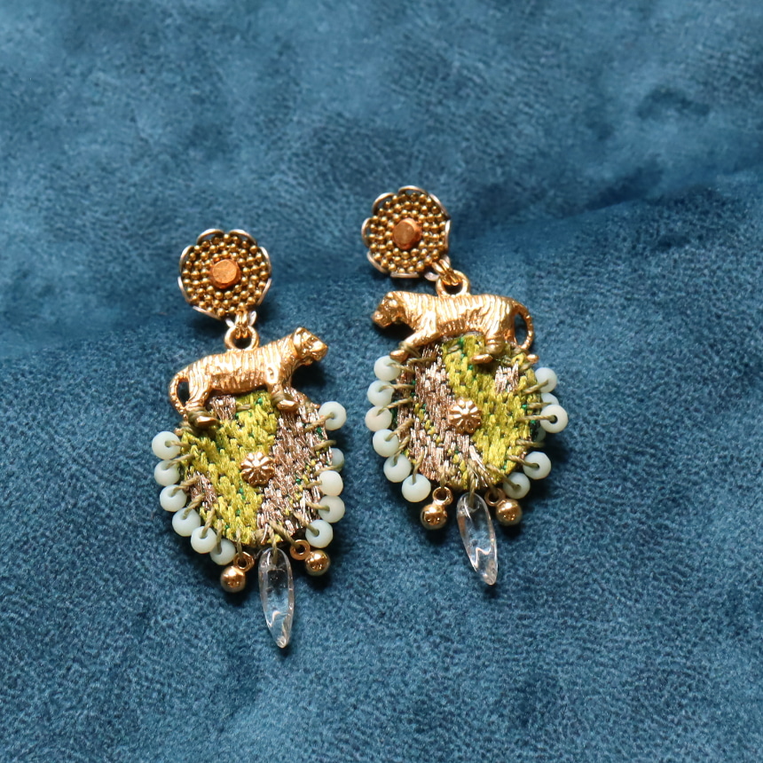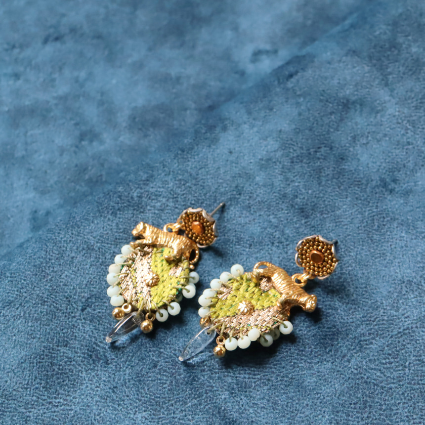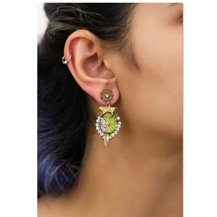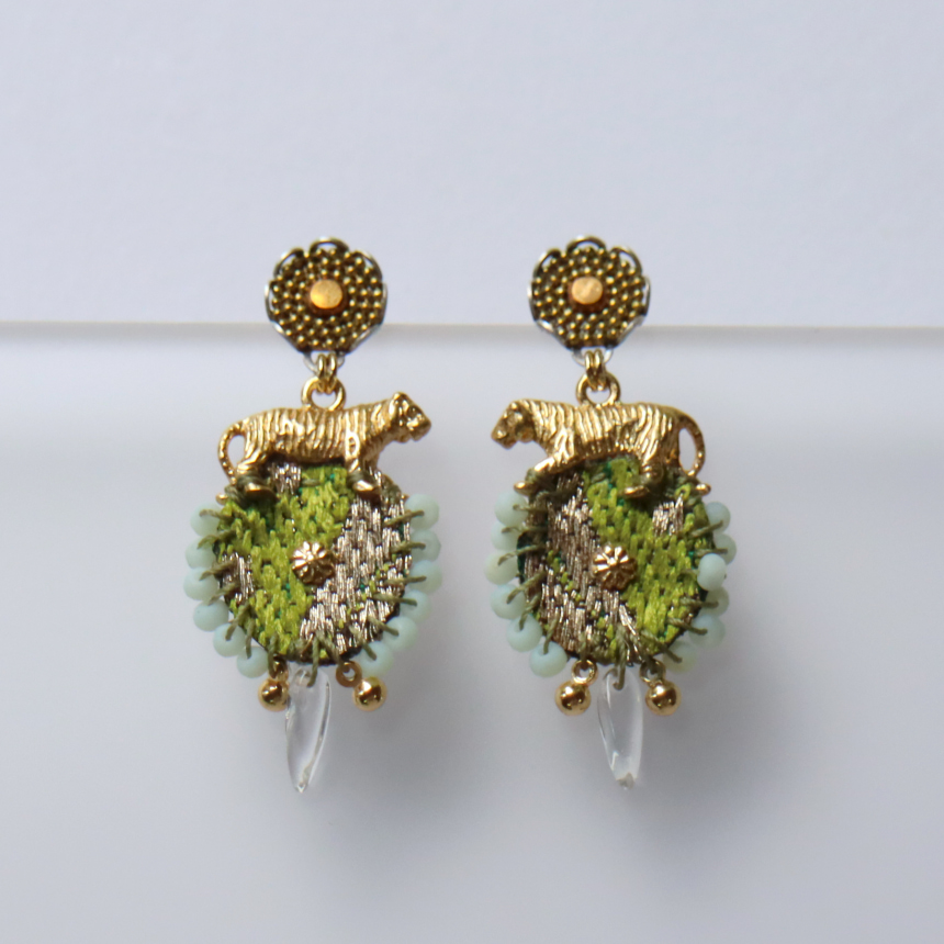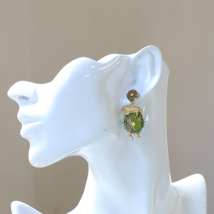 Utopian Dreamという名の、ユートピアに住む、愛らしくも神秘的な動物たちをモチーフにしたシリーズ。布やリボン、ニット素材などを取り入れ異素材のユニークな組み合わせが独創的な、ヒップコレクションならではのピアスです。