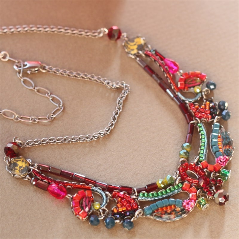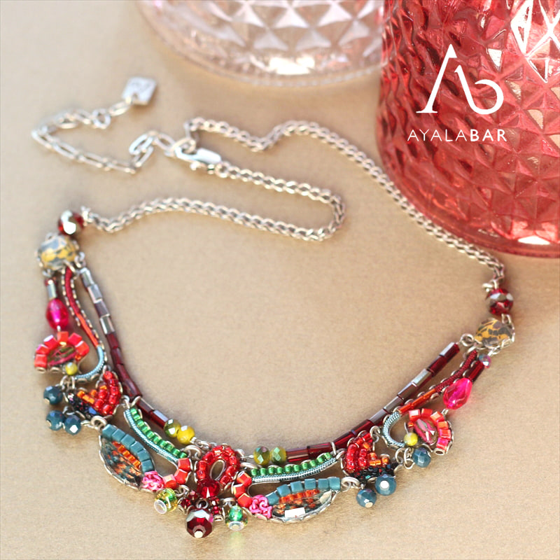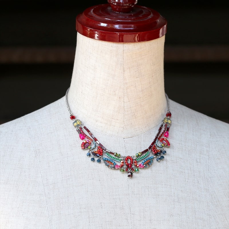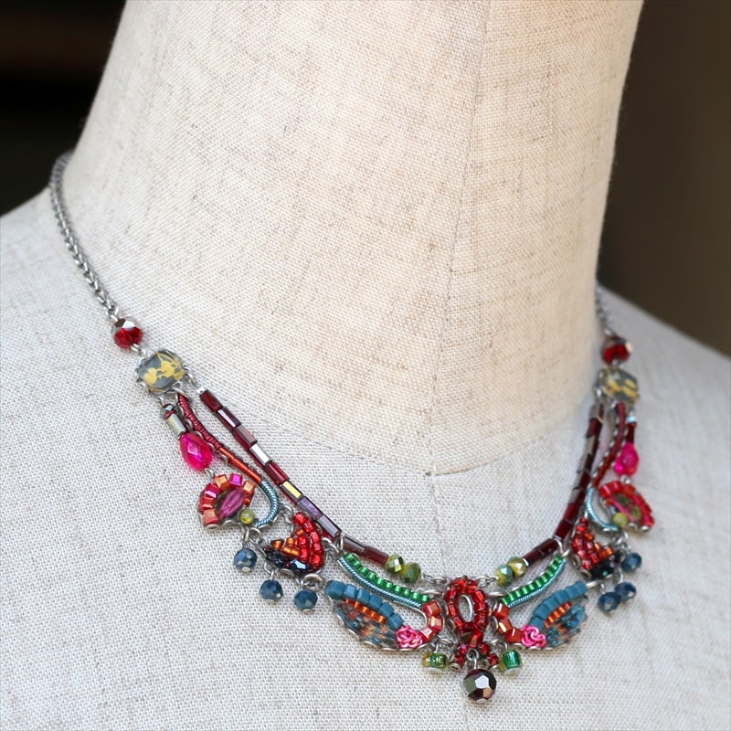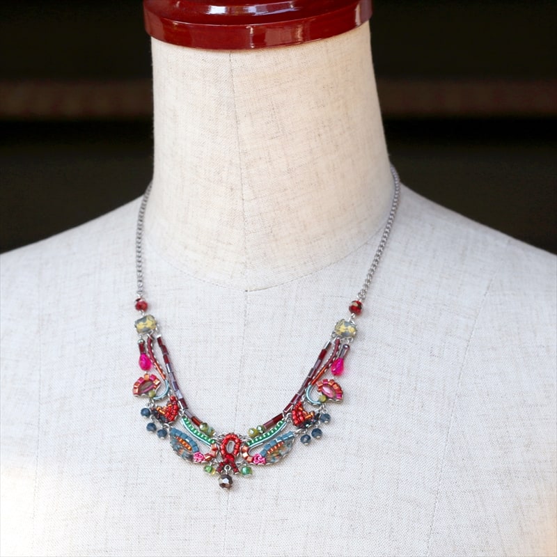 ローワンというバラ科の植物の名のついたシリーズ。赤く染まる果実が散りばめられたような鮮やかでかわいらしいネックレスです。