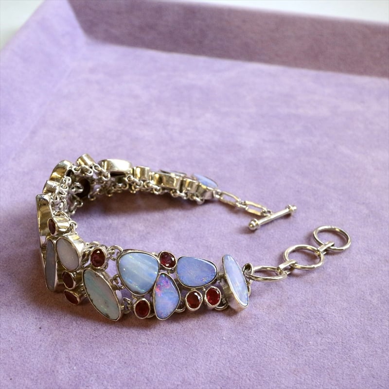 ブレスレットに仕立てられてあるものをインド・ジャイプールの工房から買い付けています。オパールの色は白から水色、やや紫がかったものもあり、それぞれに遊色効果が見られます。オパール17粒、ルビー18粒。