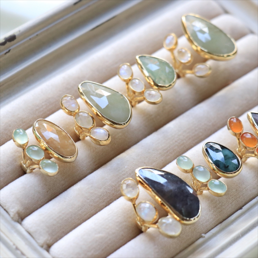 やさしい色味のベージュゴールドのサファイア。かわいらしいサイズのカボションカットの淡いパステルカラーのグリーンカルセドニーが三つ寄り添うようについたデザインのリングです。絶妙なニュアンスカラーが上品さを引き出します。それぞれの石は裏面が抜けているので、光を透す仕様になっています。※サファイア2.3×1cm