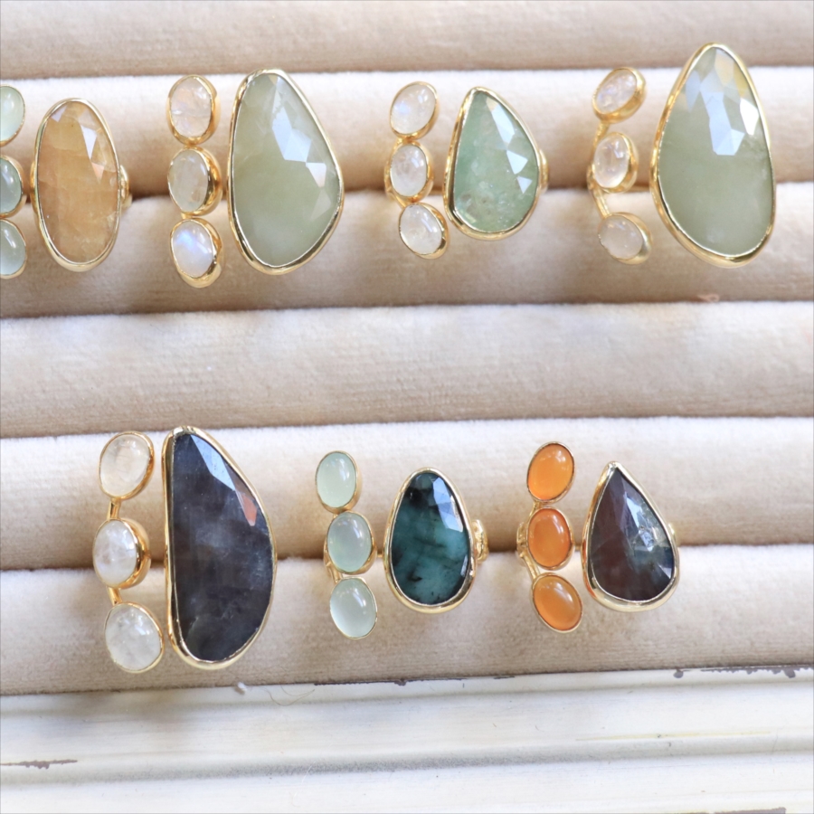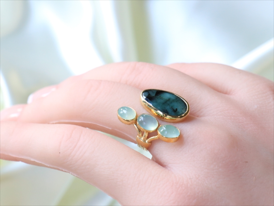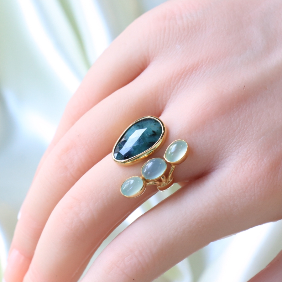 鮮やかな深いモスグリーンの中に淡い濁りの結晶がにじんだようなニュアンスあるサファイアと、みずみずしいミントグリーンのカルセドニーが三つ並んだリング。落ちついた色あいながら、サファイアの輝きが大変美しく存在感を放っています。それぞれの石は裏面が抜けているので、光を透す仕様になっています。。※サファイア1.6×1cm