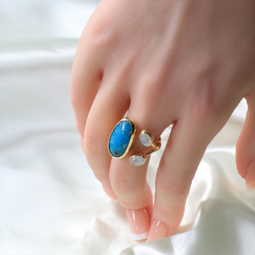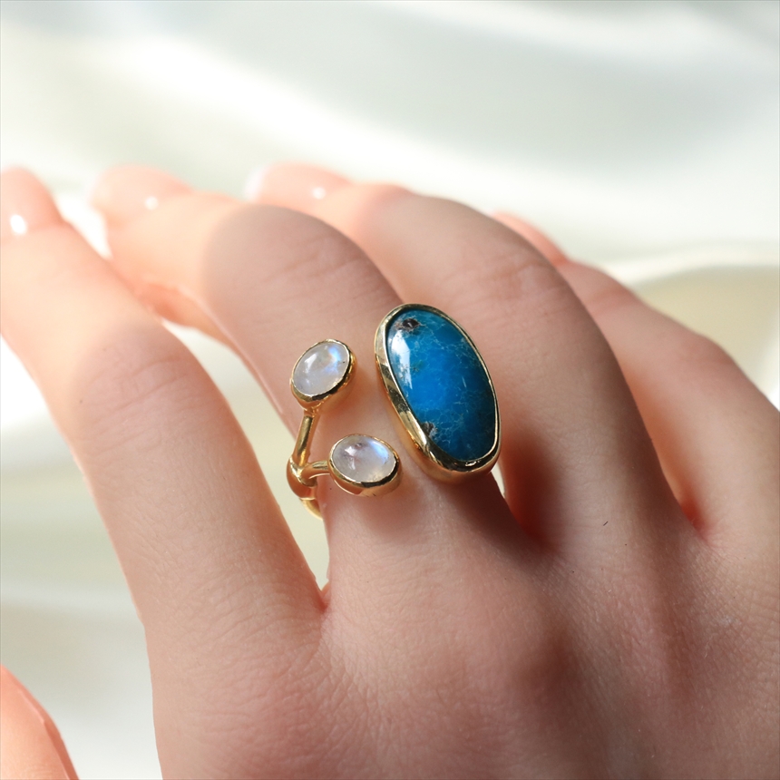 大粒のマットなターコイズと、かわいらしいサイズのカボションカットのコロンとした二つのレインボームーンストーンの組み合わせが大人っぽいリング。それぞれの石は裏面が抜けているので、光を透す仕様になっています。※ターコイズ1.8×1cm