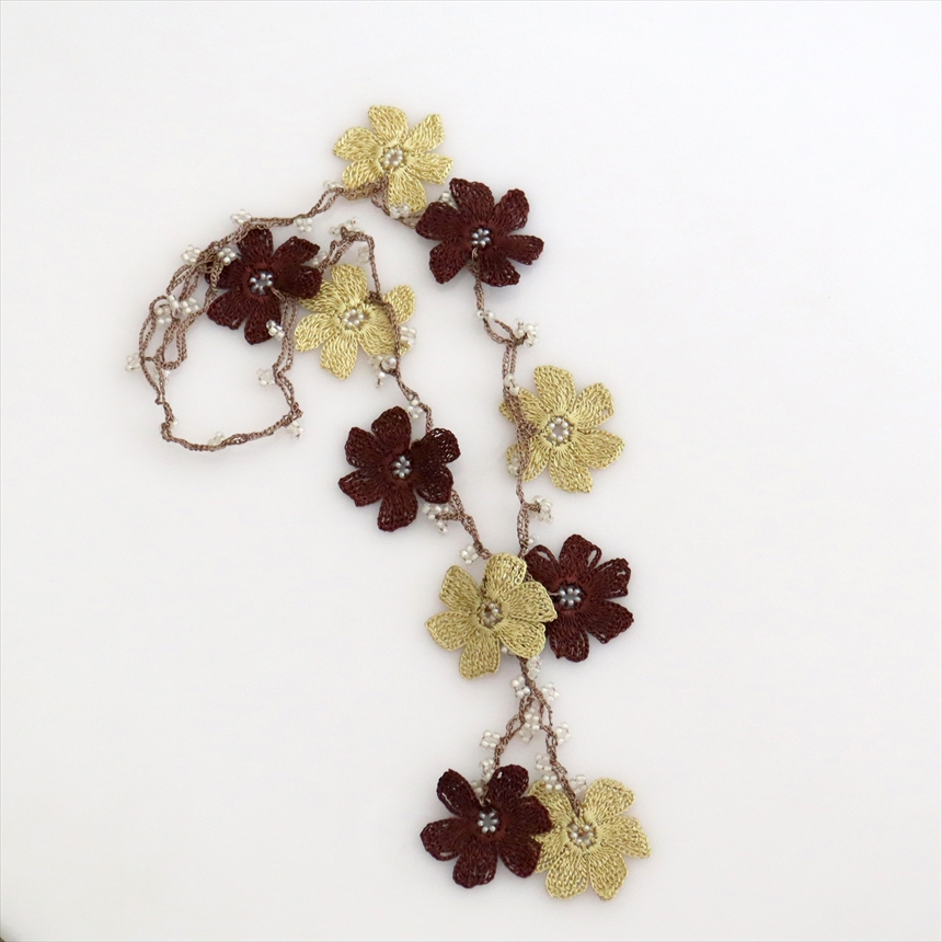 トルコのレース「オヤ」ネックレスかぎ針編みのトゥオヤ パパテヤ ブラウン・マスタード