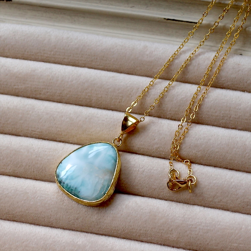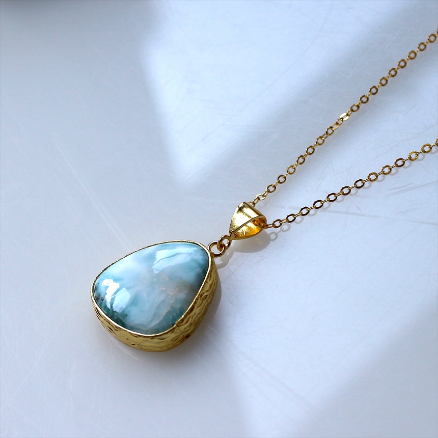 艶やかなブルーと白が何層にも重なり、美しい模様を描く、ラリマーのネックレス。つるんとした質感と、厚みのある立体的なフォルムが魅力です。ゴールドの縁取りが、ラリマーの鮮やかさを上品に引き立てます。