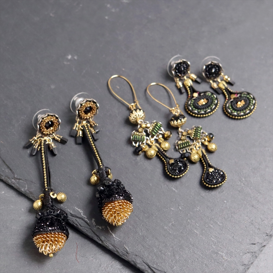 きらめくブラックビーズと艶をおさえたゴールドの融合が印象的な、Gilded Blackという名のシリーズ。しずくのように耳元でしなやかに揺れるピアスです。