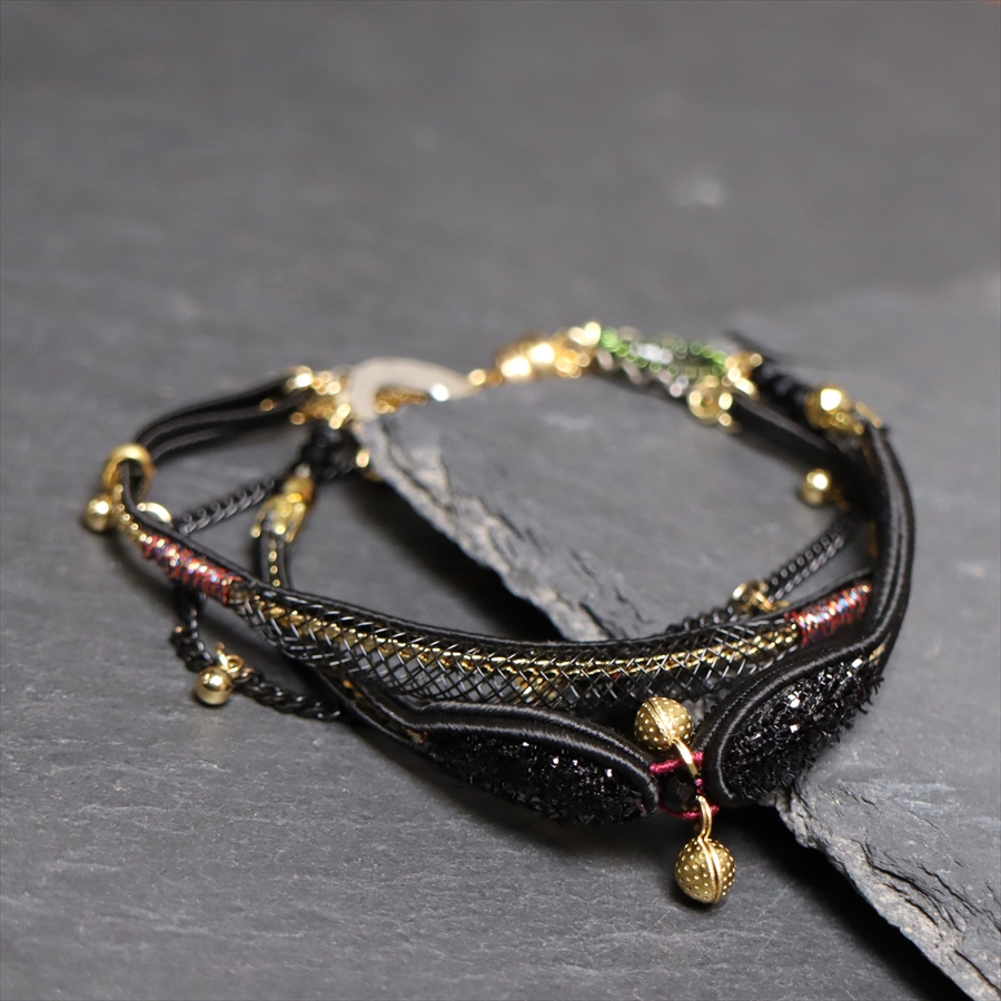 きらめくブラックビーズと艶をおさえたゴールドの融合が印象的な、Gilded Blackという名のシリーズ。繊細でユニークなパーツで表現されたさりげなく華やかなデザインのブレスレットです。