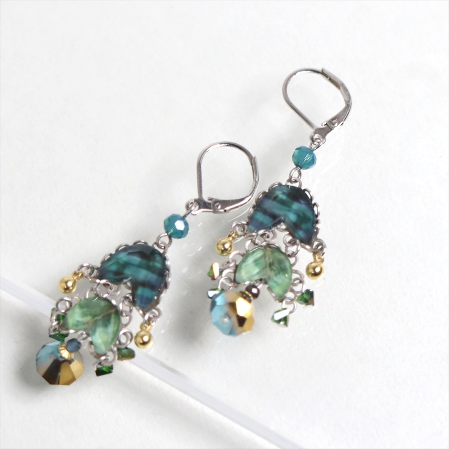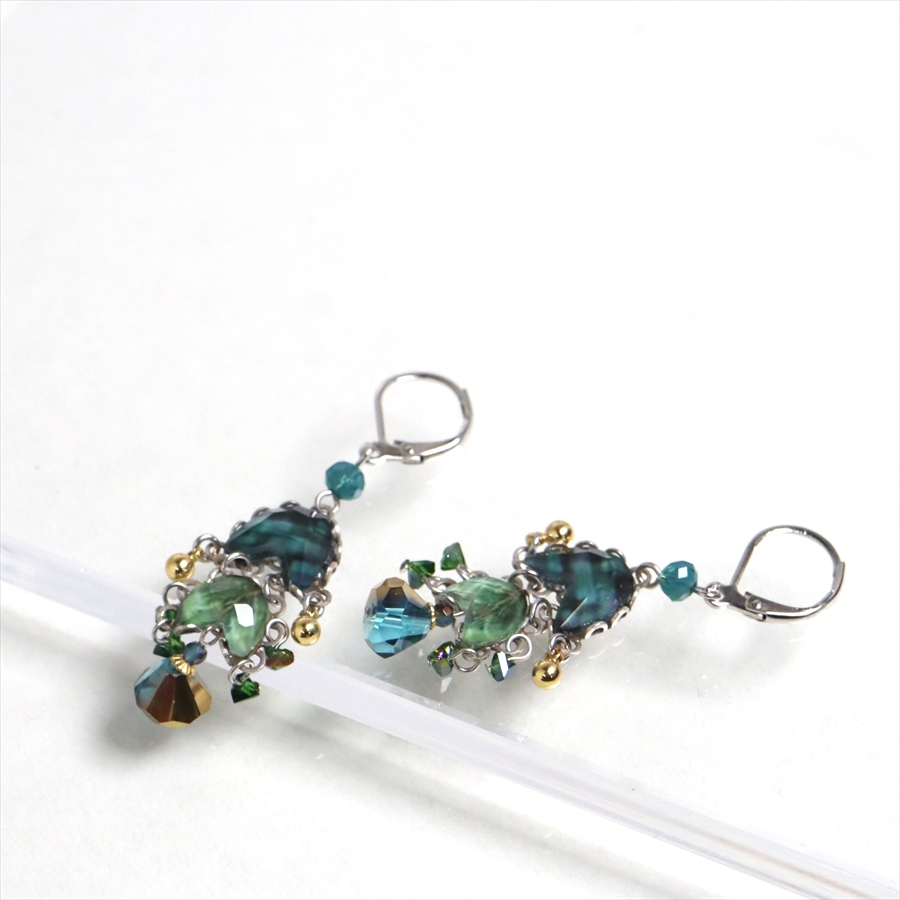 青みある深いグリーンが光を受けて、ガラスビーズに反射し優し気に輝く、Emerald Reflectionという名のシリーズ。水面に映る森のような幻想的な美しさを演出しているような雰囲気の揺れるピアスです。