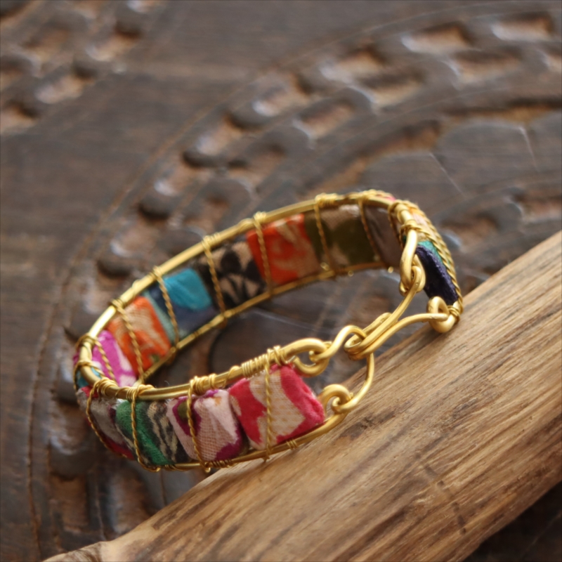 フックでとめるタイプのバングルです。布で包まれた14粒の四角いビーズを並べ、真鍮ワイヤーでつないであります。