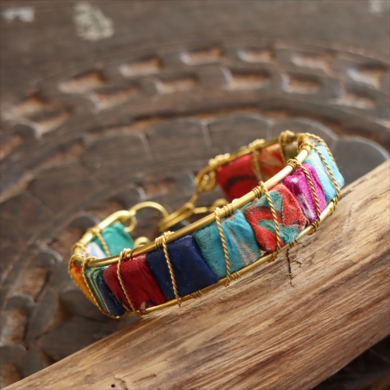 リサイクルサリー バングル 布 クラフトビーズ カラフルな四角いタイル