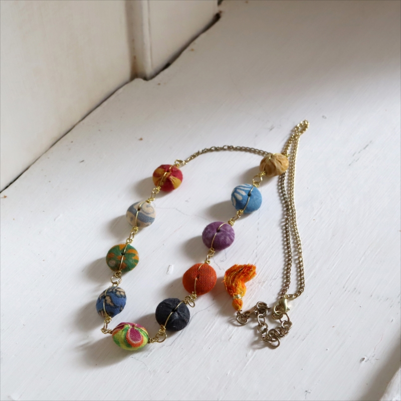 リサイクルサリーの布で包まれたカラフルな10粒のビーズを、真鍮チェーンでつなぎ合わせた手作り感あるネックレスです。60cmの長さがあり、軽い作りなので、セーターやTシャツなどに合わせてカジュアルに楽しめます。