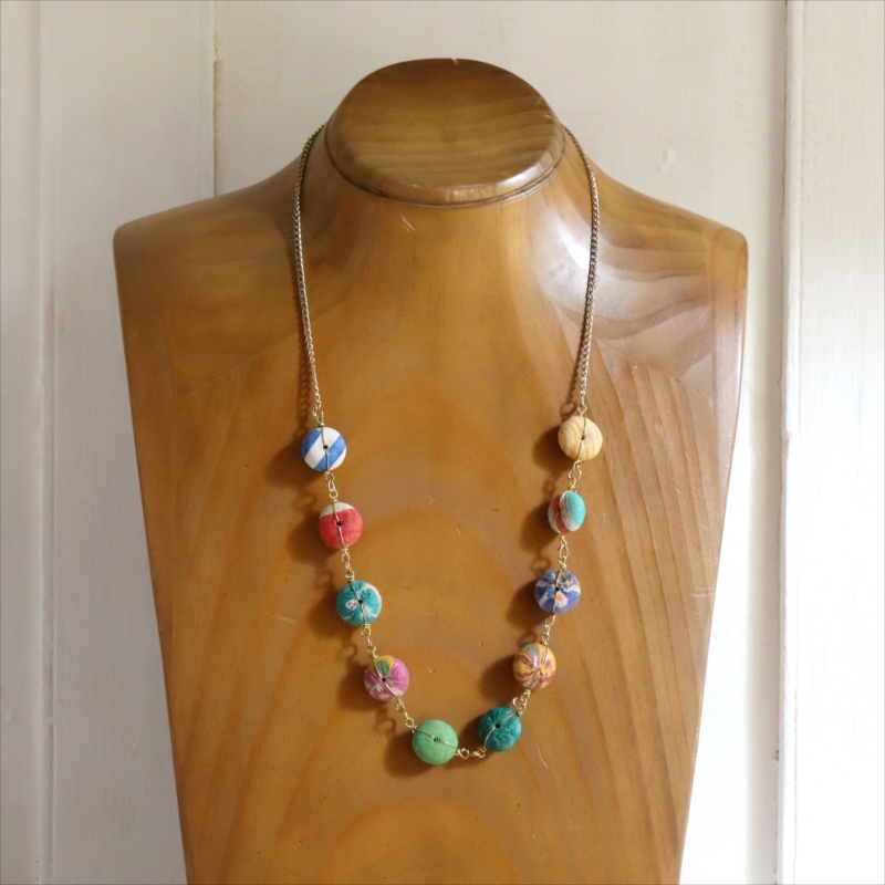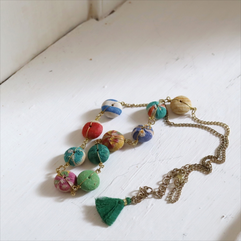 リサイクルサリーの布で包まれたカラフルな10粒のビーズを、真鍮チェーンでつなぎ合わせた手作り感あるネックレスです。60cmの長さがあり、軽い作りなので、セーターやTシャツなどに合わせてカジュアルに楽しめます。