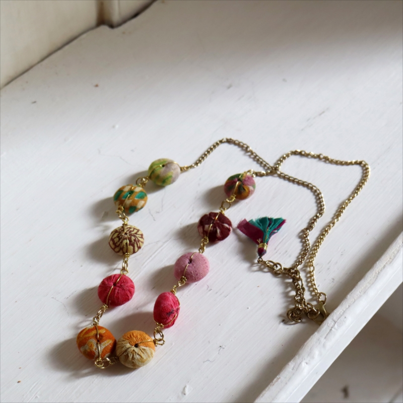 リサイクルサリーの布で包まれたカラフルな10粒のビーズを、真鍮チェーンでつなぎ合わせた手作り感あるネックレスです。60cmの長さがあり、軽い作りなので、セーターやTシャツなどに合わせてカジュアルに楽しめます。