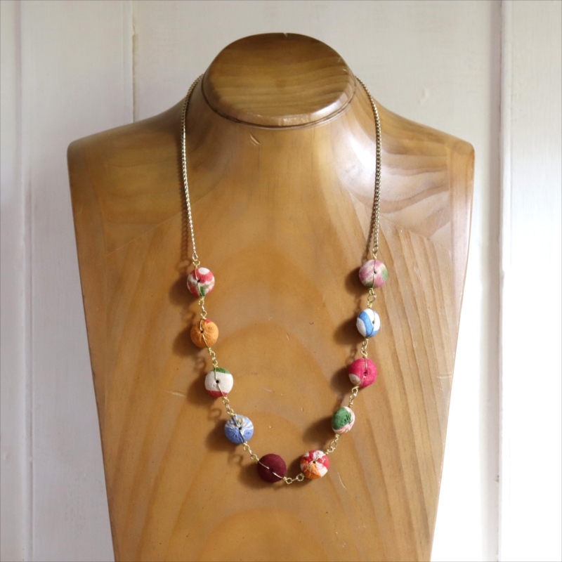 リサイクルサリーの布で包まれたカラフルな10粒のビーズを、真鍮チェーンでつなぎ合わせた手作り感あるネックレスです。60cmの長さがあり、軽い作りなので、セーターやTシャツなどに合わせてカジュアルに楽しめます。