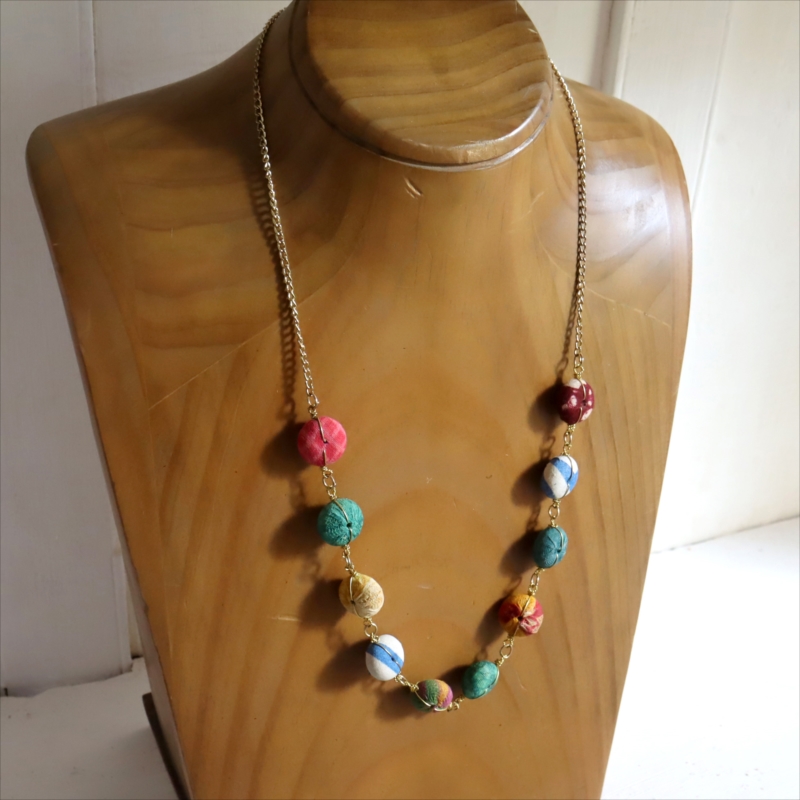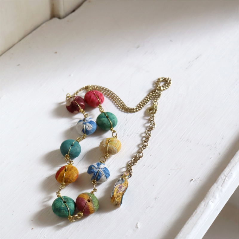リサイクルサリーの布で包まれたカラフルな10粒のビーズを、真鍮チェーンでつなぎ合わせた手作り感あるネックレスです。60cmの長さがあり、軽い作りなので、セーターやTシャツなどに合わせてカジュアルに楽しめます。