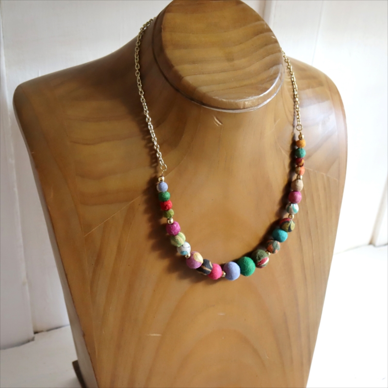大きさの異なる布で包まれたビーズをつないだクラフト感あるネックレスです。