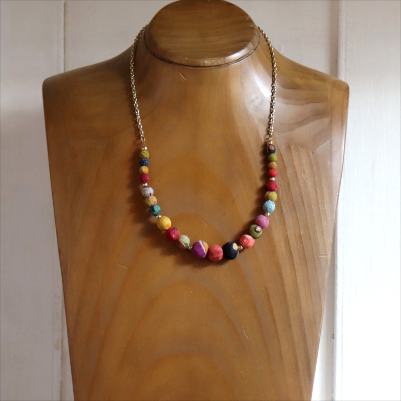 大きさの異なる布で包まれたビーズをつないだクラフト感あるネックレスです。