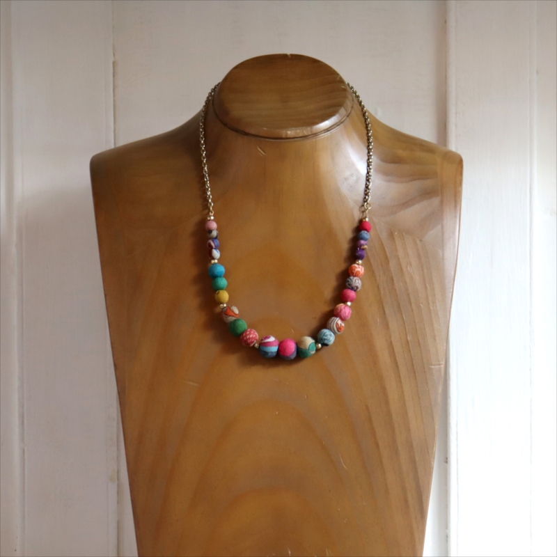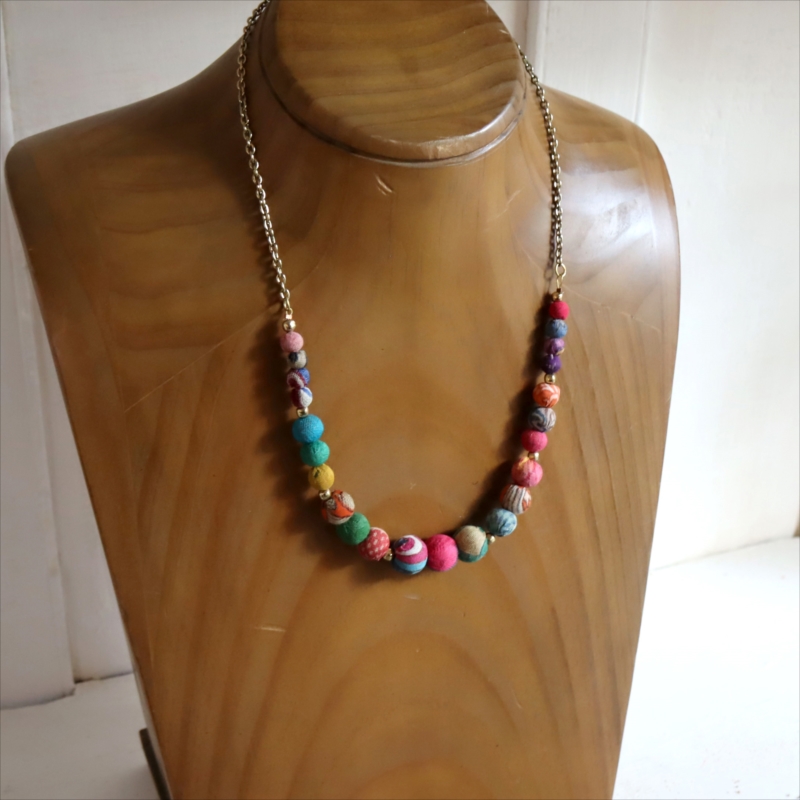 大きさの異なる布で包まれたビーズをつないだクラフト感あるネックレスです。