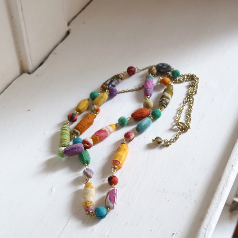 リサイクルサリービーズ 2連ネックレス カラフルな手作り布ビーズ 1点もの