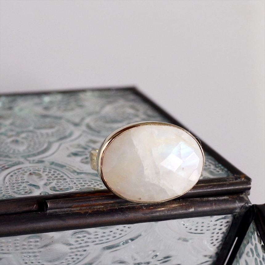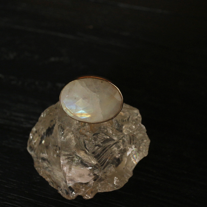 透明な光の中に、青や虹色のシラーがふわりと浮かぶ幻想的なレインボームーンストーンを、存在感のある太めのアームにしっかりと包み込んだ、力強くも美しいリングです。神秘的なきらめきを見せてくれます。