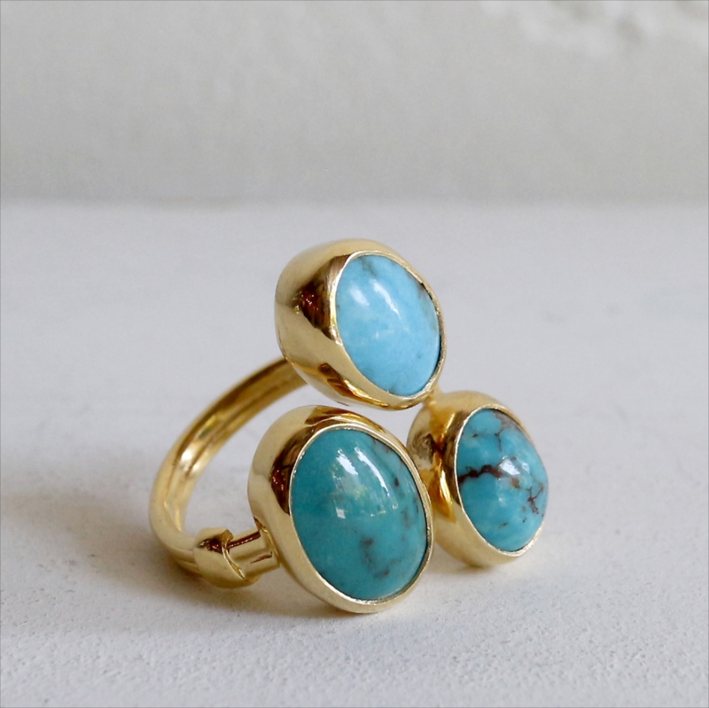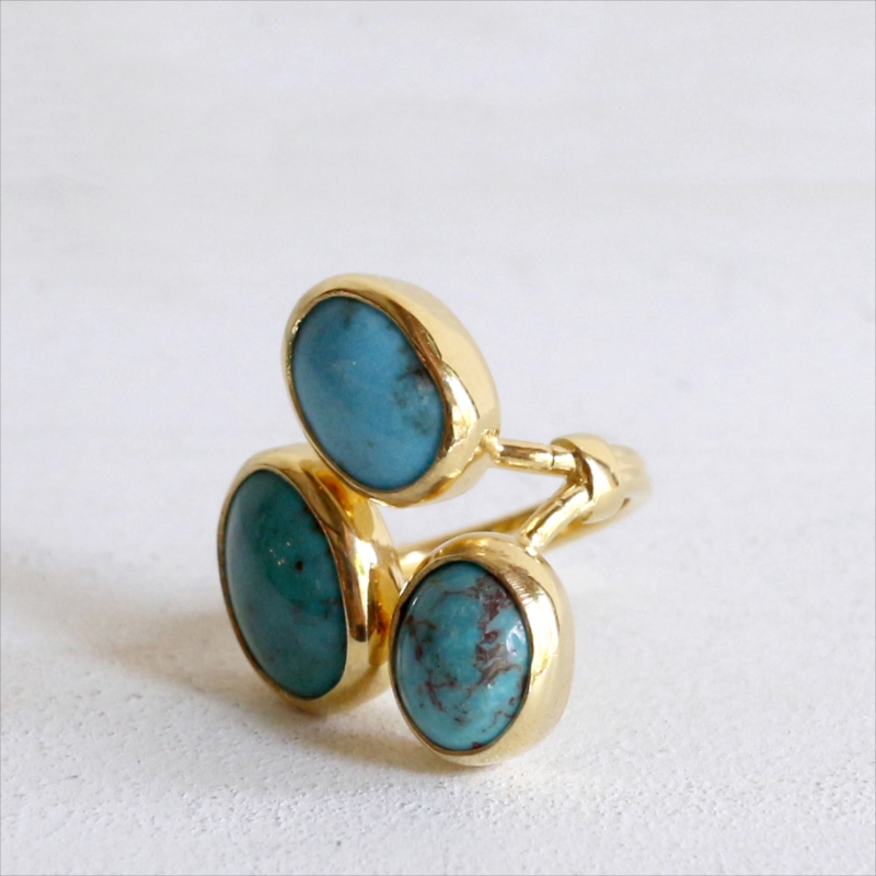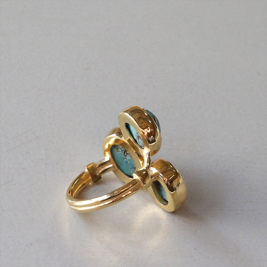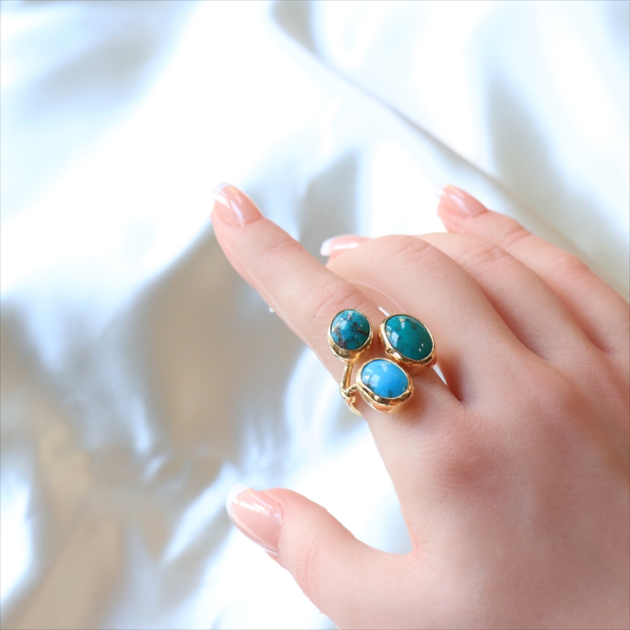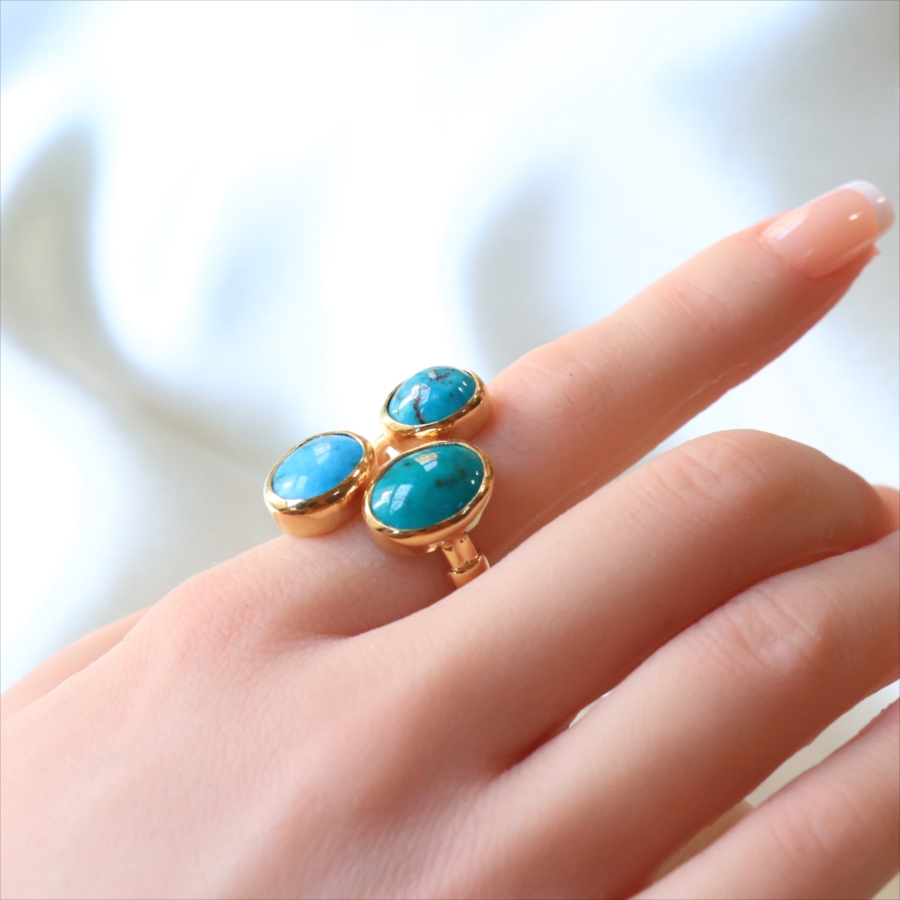 三つの色の違うマットなターコイズカラーを集めたユニークなデザインのリングです。それぞれの異なるターコイズの自然な色ムラや模様が色合いが、唯一無二の美しさを作ります。※大きいターコイズ1.5×1cm